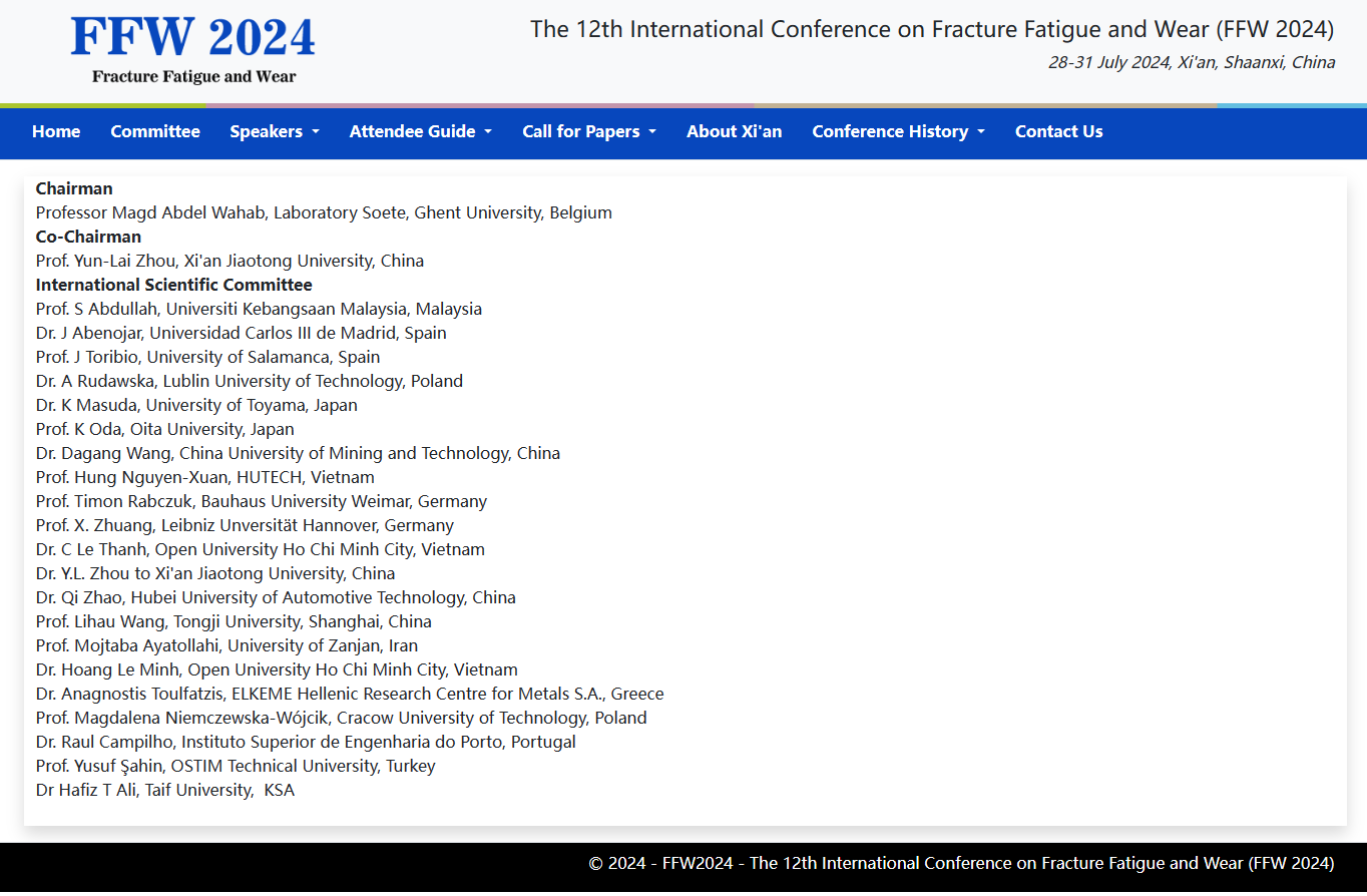 本网讯(文/赵齐)近日,beat365材料学院赵齐博士受聘为第12届断裂疲劳与磨损国际会议(The 12th International Conference on Fracture Fatigue and Wear,简称FFW 2024)学术委员会成员。据悉FFW国际会议已经连续举办11界,在欧洲享有盛誉,会议主席由比利时根特大学(全球百强大学)工程系Magd Abdel Wahab教授担任。由于根特大学与中国高校的合作,FFW2024会议将定于2024年7月28-31日在西安举行,将由根特大学和西安交通大学联合主办。FFW会议学术委员会成员遴选有着极其严格的标准,受聘成员需为在断裂力学领域做出较大贡献并有一定学术影响力的学者或工程师。本次国内受聘FFW2024学术委员会成员有西安交通大学周运来教授、同济大学王莉华教授、中国矿业大学王大刚教授及beat365赵齐博士。