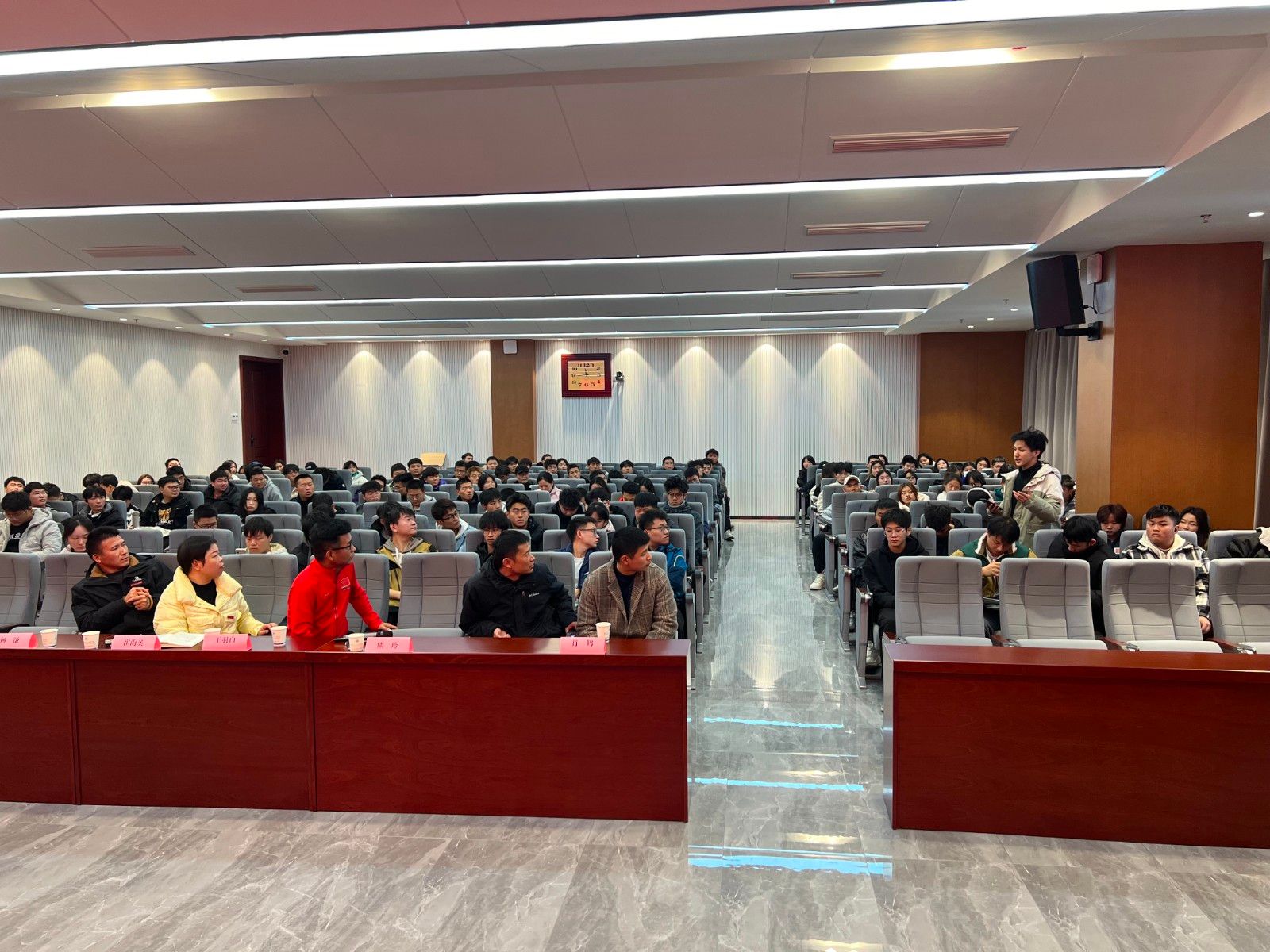 机械工程学院分党委书记崔海英致欢迎辞。讲座上,王羽白从11月份代表中国参加2023年在菲律宾举行的第22届亚洲大师田径冠军赛60岁-64岁组比赛,获得100米铜牌,4×100米接力银牌,4×400米接力金牌(破亚洲同龄组记录)的精彩视频花絮引入。重点分享了从体育给职场生涯会带来什么?职场对人的评价体系与学校有什么不同?“客户永远是对的”这句话对吗?从业务员到管理者的路径等四个方面给大家分享了职场生涯规划的宝贵经验,特别是充分诠释了体育对于职场生涯的促进作用。他希望同学们在听取讲座后,认真思考,规划和设计好自己的职业生涯,将体育精神结合到自己的职业生活中去,贡献国家,贡献社会,贡献母校。互动提问环节,面对同学们的热情提问,王羽白毫无保留的解答了大家的疑惑,赢得了同学们的阵阵掌声和高度认同。