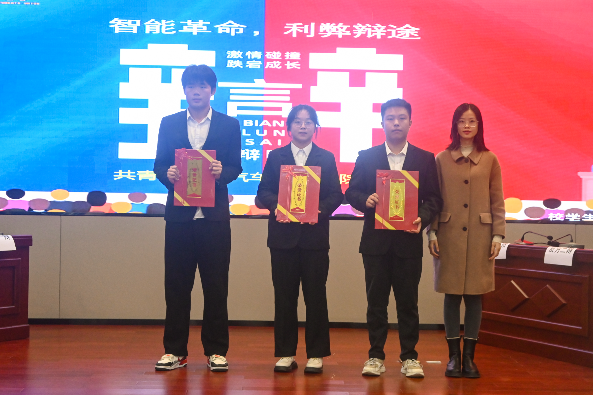 本网讯(文/王小雨)风歌万阙,半曲未休,惊雷闪落,珠玑字字。“新生杯”辩论赛决赛于11月27日在产教大楼三楼报告厅举行。本届辩论赛由校团委主办,校学生会和辩论与口才协会共同承办。校团委老师鲍洁、王小雨、杜伦,辨协副会长王添鑫,辩论队伍指导员王翔宇作为嘉宾评委,出席了此次辩论赛。决赛的辩题是“人工智能对普通人而言,是机遇大于挑战还是挑战大于机遇?”,正方经济管理学院与反方汽车工程学院就此展开激烈的辩论。