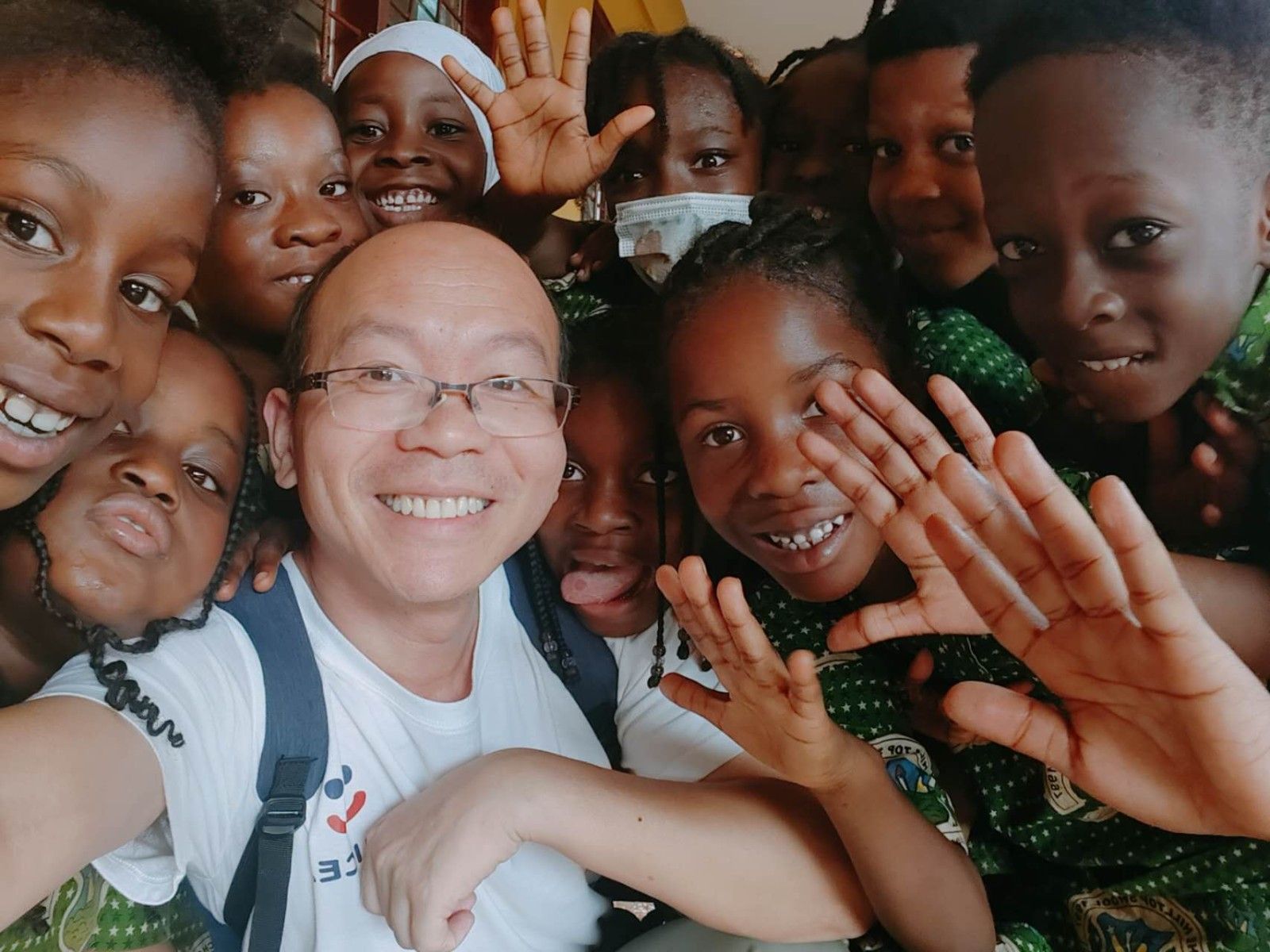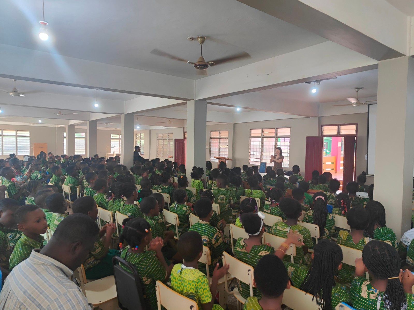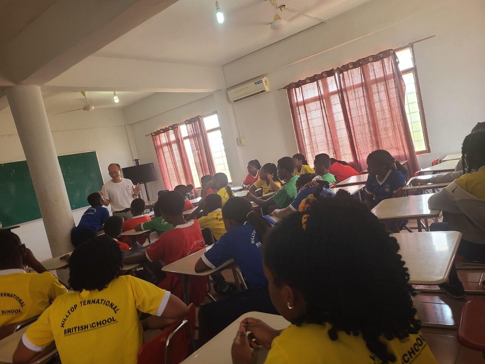 本网讯(文/图 苏子波、周桂平)加纳时间1月19日上午,beat365孔子学院院长苏子波和副院长周桂平应邀到库玛西山顶白金学校(Hilltop Platinum School)开展了近4个小时的中文体验课,课程内容包含中文歌曲、中文寒暄、汉语声调及筷子练习等体验活动。该校本部和国际部共计4个批次600余名中小学生参加了本次活动,中文学习热情高涨。