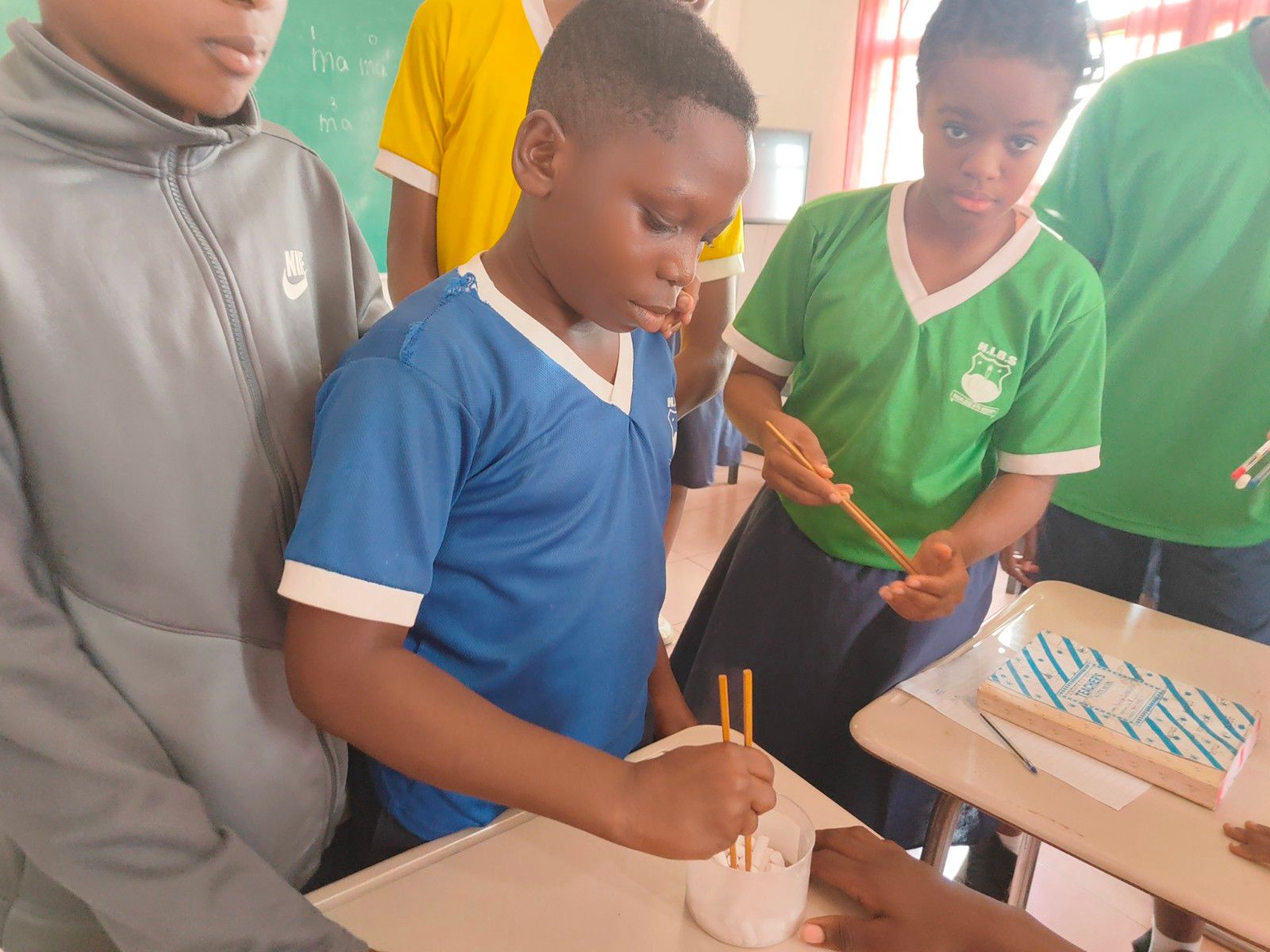 苏子波负责给国际部的不同年级临时组成的混合班级上课。他先教孩子们中国人打招呼的方式,从“你好”到“您好”,从“吃了吗”到“去哪儿”,既注重讲授语言使用的正确场合,也注重培养孩子们的礼貌意识。随后,他用“妈妈骑马”绕口令让孩子们感受汉语声调的奥妙。最后,他拿出事先准备好的筷子教孩子们如何使用。由于筷子数量有限,学生们争先恐后“抢”筷子,有的很快就学会用筷子夹起粉笔头了。