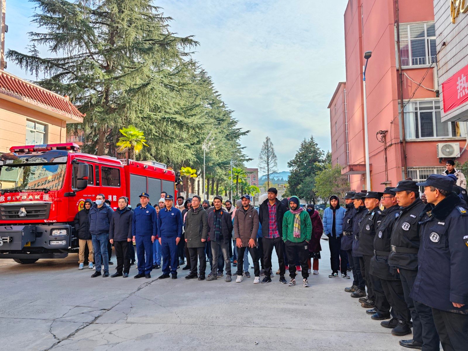 学工部、国际合作交流处、红卫街办周家沟社区、保卫处全体人员、保安、宿管值班员、留学生、红卫消防救援站消防员等200余人参加此次演练活动。(审稿杨长春)