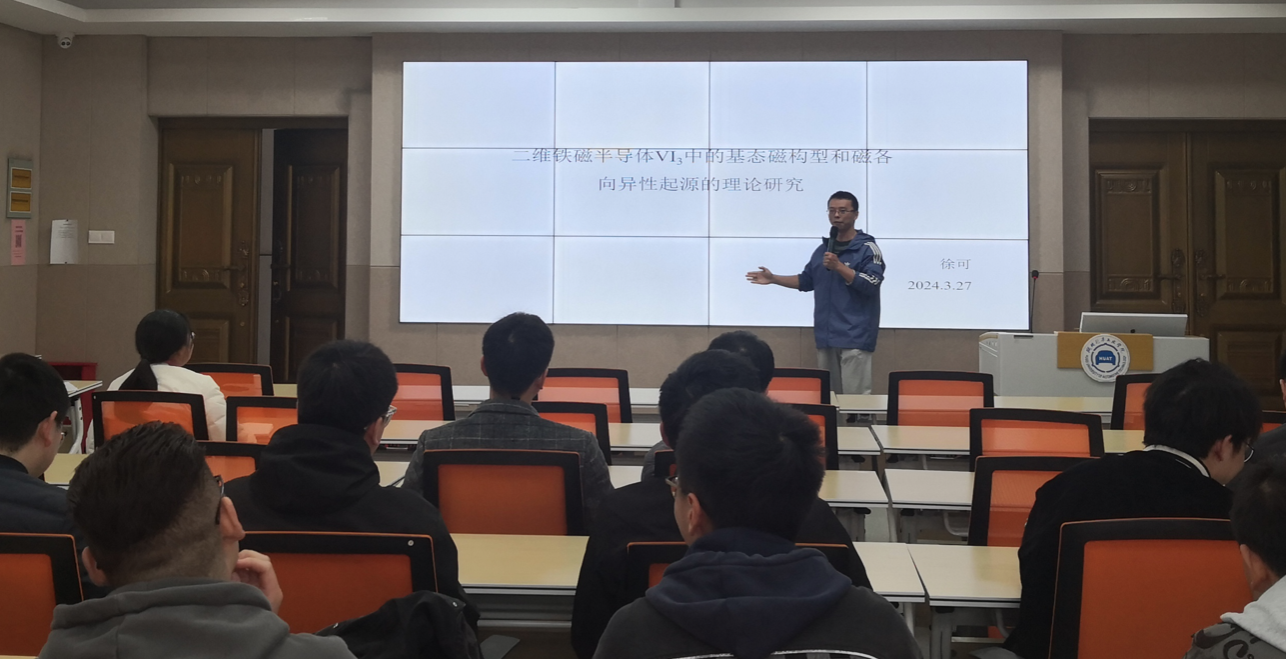 “格致论坛”第31讲由徐可副教授主讲。他回顾了二维铁磁半导体VI3的研究现状,并针对目前研究中存在的矛盾,从结构对称群出发,通过底层构造波函数、控制轨道占据的方案解释了晶体场劈裂方式和自旋轨道耦合的共同作用。徐可副教授的研究紧跟科研热点,讲解细腻,引发师生广泛讨论。