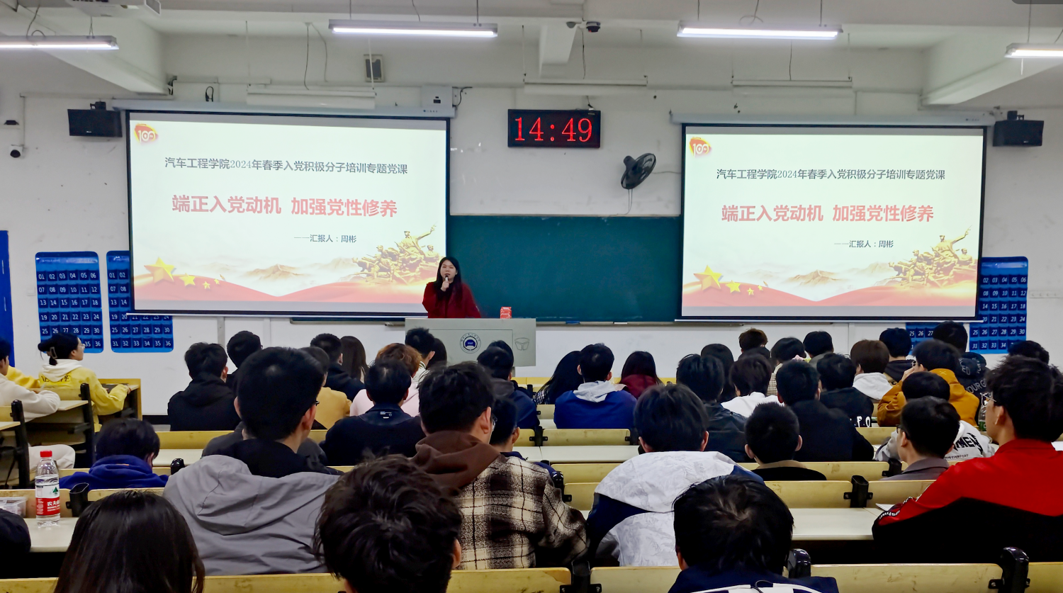 本网讯(文 李键雯、周彬/图 曹庭钊)“组织入党一生一次、思想入党一生一世!”……为严格把好党员发展入口关,加强入党积极分子队伍思想政治引领,筑牢理想信念根基,3月24-27日,汽车工程学院以“坚定信仰心向党 奋勇前行做先锋”为主题,举办了2024年第一学期入党积极分子培训班。学院分党委副书记周彬,学生党支部书记胡霄寒、李键雯以及全院近200名入党积极分子参加培训。