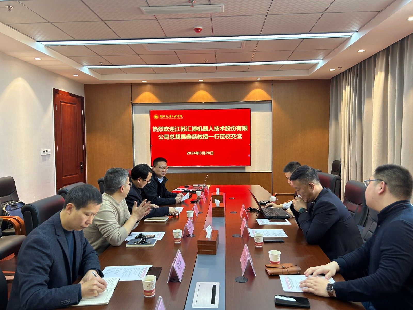 本网讯(文/梁姗姗)3月28日下午,江苏汇博机器人技术股份有限公司副总裁禹鑫燚一行来校交流。相关二级学院副院长、专业负责人、教务处相关人员等参加了会议。会议由教务处副处长周明智主持。