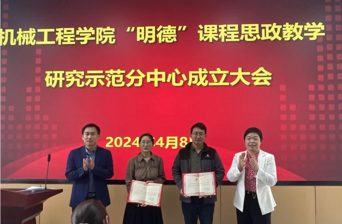 依据学校《关于成立“明德”课程思政教学研究示范中心分中心的通知》文件要求,王宸宣读了《机械工程学院“明德”课程思政教学研究示范分中心建设通知》文件,并从职能定位、建设目标、工作机构和工作职能四方面介绍了分中心概况。崔海英向分中心两位特聘研究员成继平和王莽莽颁发了聘书。