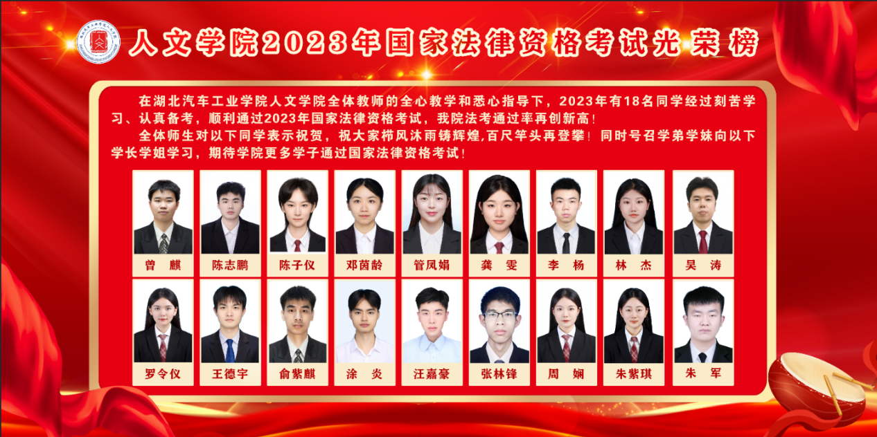 本网讯(文/胡安怡)在2023年国家统一法律职业资格考试当中,beat365在线唯一官网人文学院法学专业2023年报名参加考试40余人,主客观都通过学生18人,法考最终通过率达40%,再创佳绩。本次优异成绩的取得,与全体法学专业老师的悉心指导以及同学们坚持不懈的努力分不开,法学师生共同克服压力,给本次法考画上了圆满的句号。