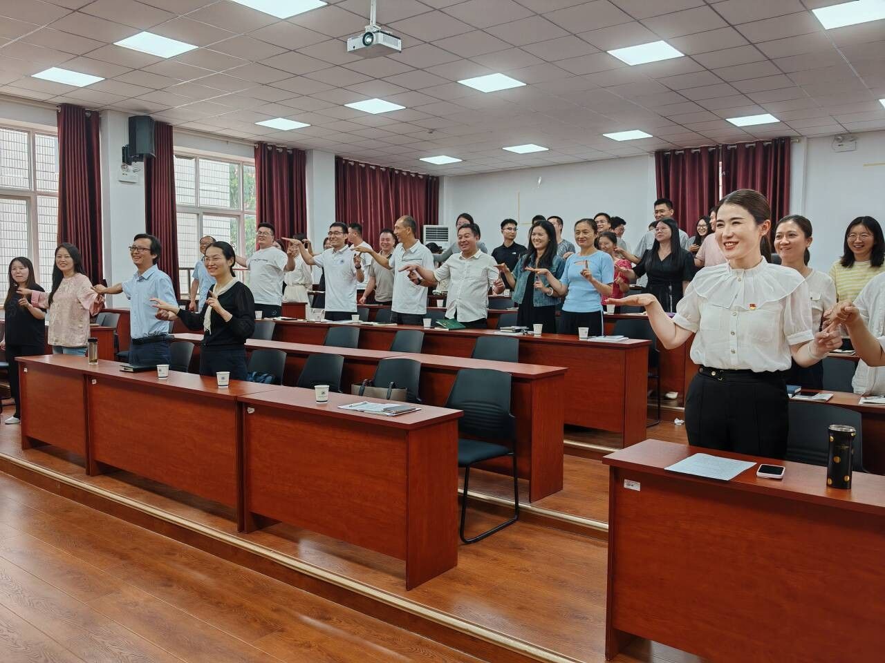 活动以《上春山》手掌韵律操作为热身开场,在轻快的节奏中,老师们纾解了一天的工作压力,以身体的律动带动心理能量。随后,王嘉丽用捉逃手指的游戏,邀请大家体验压力,并讲解了交感神经系统与副交感神经系统在压力管理中的不同作用,帮助大家了解和识别压力状态下身体各部分的反应。最后,利用抽卡赋能的小测试,帮助老师们练习自我觉察,倾听自己的心声,并给出了身体锻炼、冥想与深呼吸、情绪管理等压力应对方法。现场积极参与活动和分享的老师都收到心理中心精心定制的纪念品,活动在轻松愉快的氛围下结束。