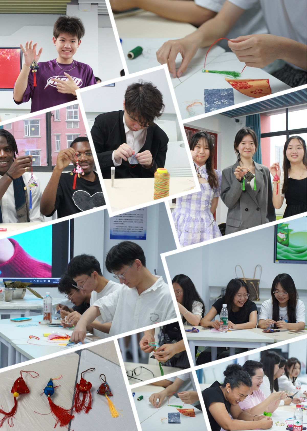 在简单快乐的单词接龙游戏结束后,进行了包粽子、绣香囊、编手绳等DIY趣味活动。包粽子时,同学们纷纷化身“手工家”,在老师的指导下亲手制作粽子,从准备粽叶、糯米、红豆等食材,到包裹、捆绑,每一步都充满了乐趣和挑战,嘉宾老师和留学生也积极参与到活动中,大家互相帮助,互相学习,现场气氛热烈而温馨。一双双巧手不停地忙碌着,缠粽叶的草绳飞舞着,转瞬间一个个形态各异的粽子便成型,看着自己亲手制作的粽子,同学们脸上洋溢着满足和自豪的笑容。