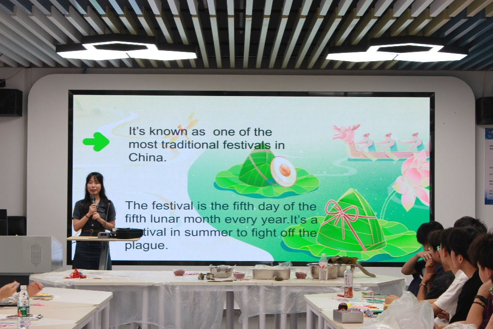 活动伊始,张希瑶、汪如意、王亚鑫三位同学以英语演讲的方式引入主题,向老师和同学们介绍了端午节的起源和传统习俗。