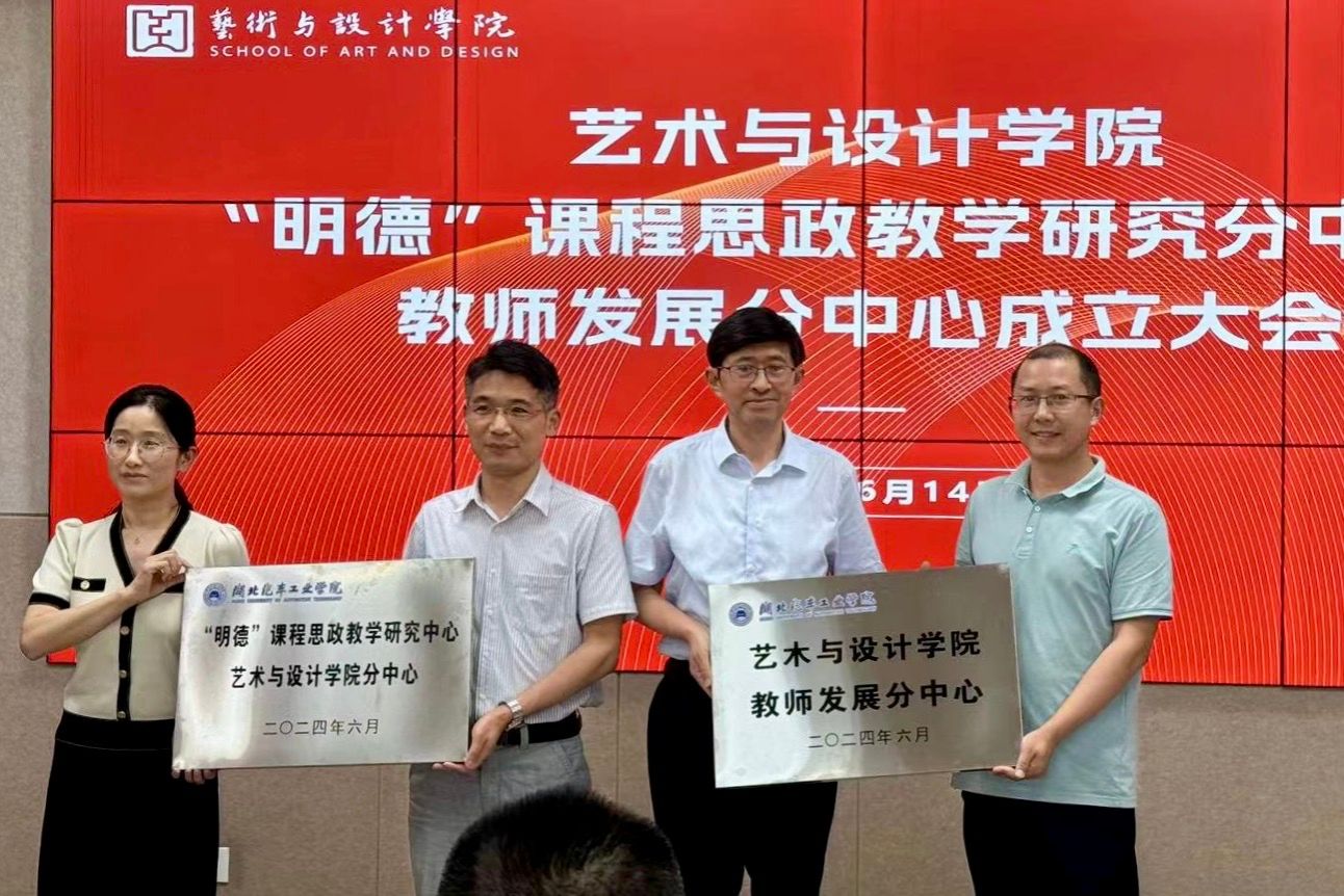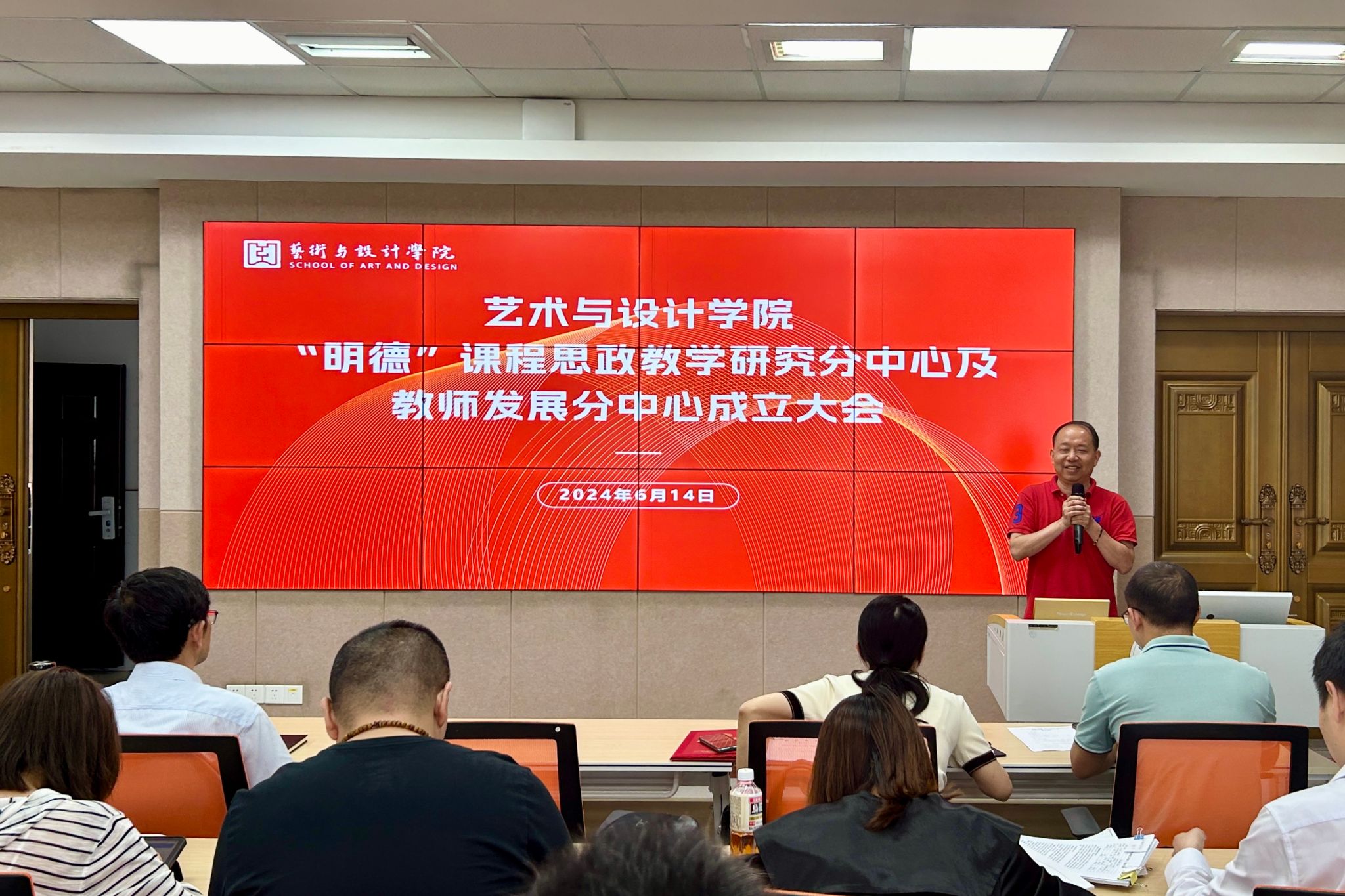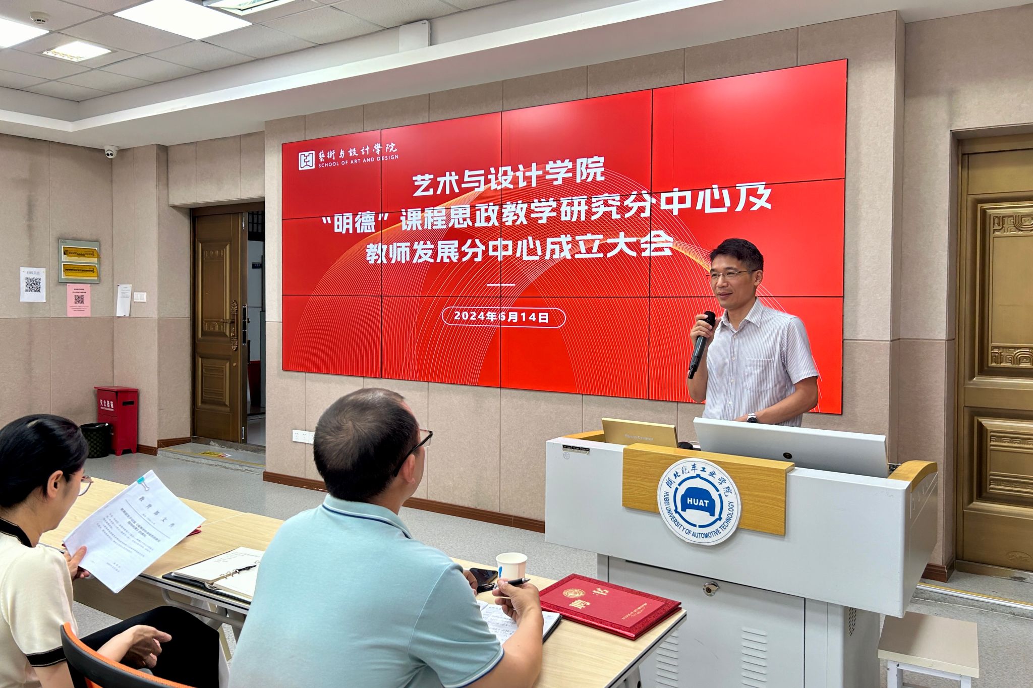 本网讯(文/图张莹、黄萌颖)6月14日下午,艺术与设计学院在1305多功能报告厅顺利召开“明德”课程思政教学研究分中心及教师发展分中心成立大会。学校本科教学督导喻方元教授、马克思主义学院副院长成继平教授、教师发展中心郭一鸣教授、艺术与设计学院党政领导班子和全体教职工出席大会,大会由副院长龚青山教授主持。