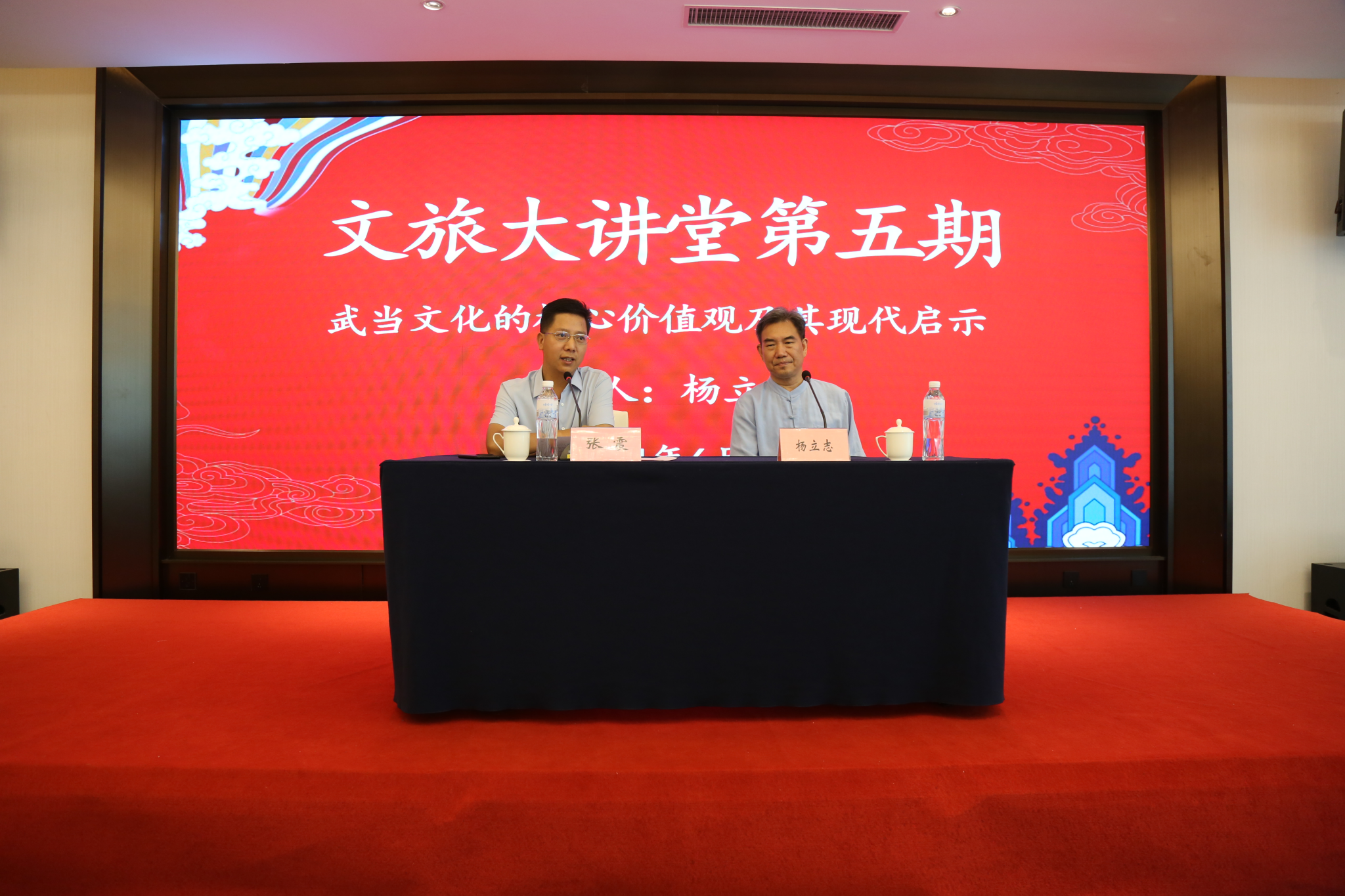 本网讯(文/马保青)6月15日,由武当山文旅集团主办的武当文旅大讲堂在武当山旅游经济特区君澜酒店培训大厅正式开班,beat365在线唯一官网武当文化研究与传播中心主任杨立志教授应邀为武当文旅大讲堂授课。武当山文旅集团董事长张震、武当山文旅集团党委书记赵大明参加开班式,武当山文创、武当山旅行社、武当山君澜酒店等10多个集团分公司领导和员工参加此次培训活动。