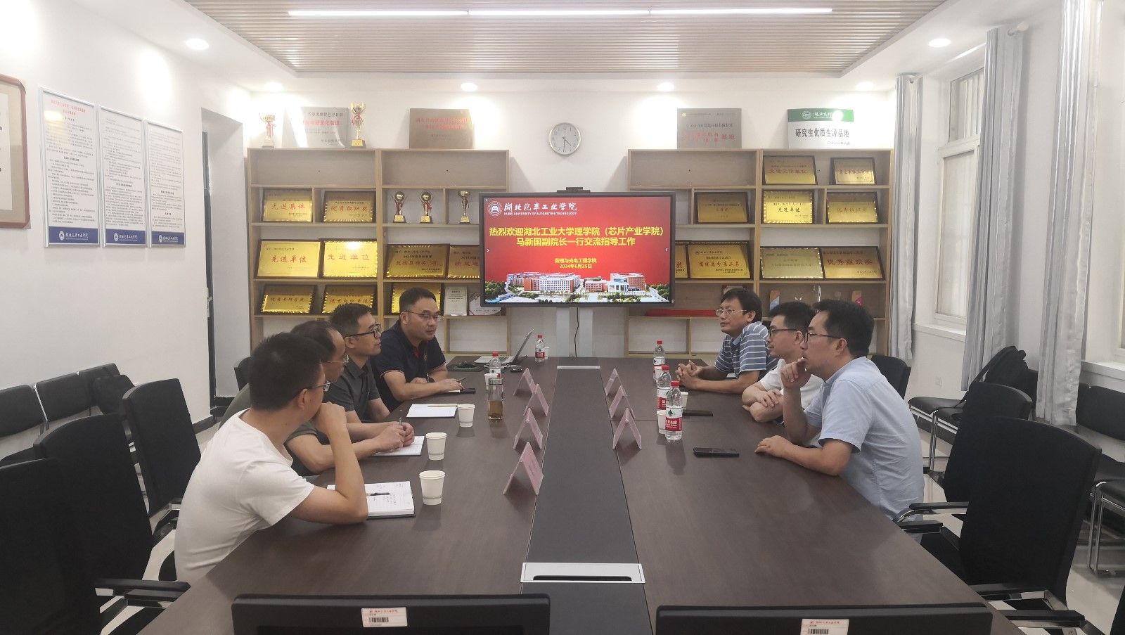 本网讯(文/图 吴晴)6月25日下午,湖北工业大学理学院(芯片产业学院)副院长马新国、实验与资产中心主任姚育成、信息与计算科学系主任方次军一行来校调研交流。数理与光电工程学院副院长王晴岚、副院长张传坤,光电科学与技术系主任曾维友、材料物理系副主任杨俊涛、应用数学系青年教师吴俊博士参与座谈交流。