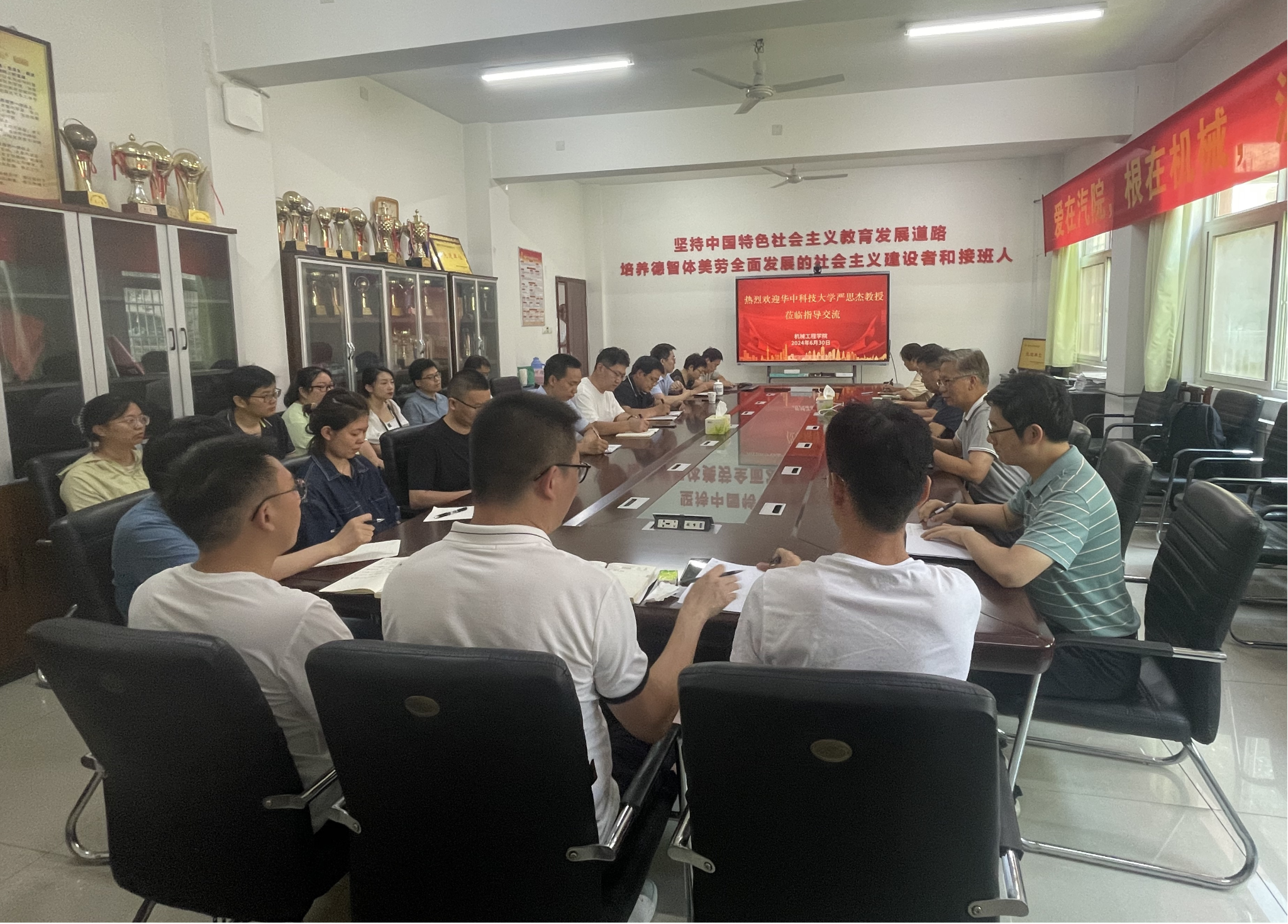 本网讯(文/图 宋俊、余梦)为加强学院学科团队建设、提升青年教师科研能力,6月30日下午,机械工程学院邀请华中科技大学教授、无锡中车时代智能装备研究院有限公司董事长严思杰一行莅临学院206会议室开展座谈交流。学院领导班子、科研团队负责人、青年教师参加座谈,座谈会由机械工程学院院长王保华主持。