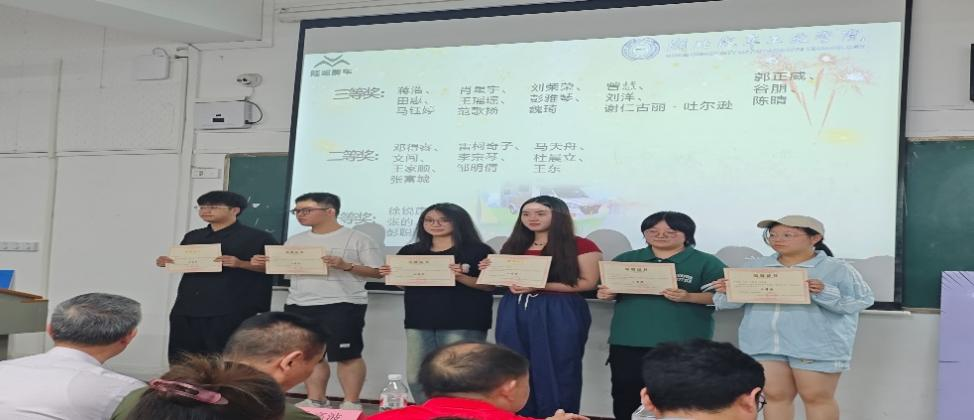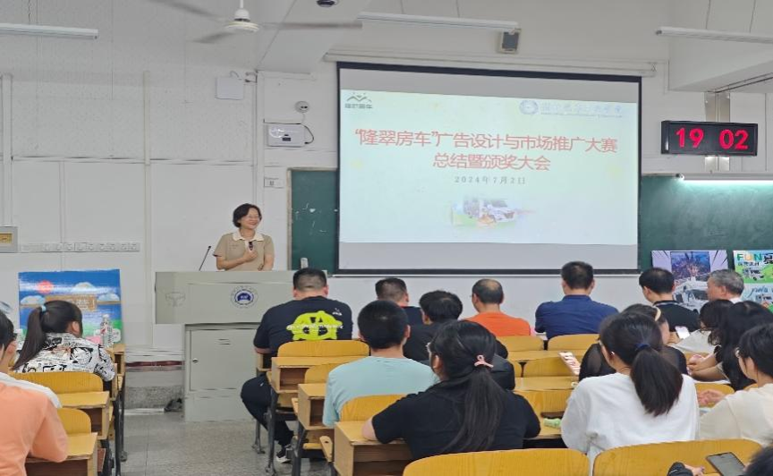 艺术与设计学院田靖涵老师介绍了广告设计大赛情况,并展示了优秀的海报设计作品,肯定了同学们能够围绕隆翠房车的品牌理念,展现出对房车生活的深刻理解和独特视角。教务处李行国副处长、艺术与设计学院龚青山副院长宣布获奖名单,各位嘉宾共同为获奖学生颁奖。