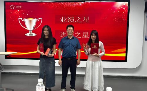 在表彰会上,东维科技有限公司和外国语学院共同向“业绩之星”“进步之星”“优秀班组长”“热爱之星”和“气氛之星”颁发了获奖证书、奖牌和奖金,3名优秀实习生代表分享了企业实习成长心得和收获。