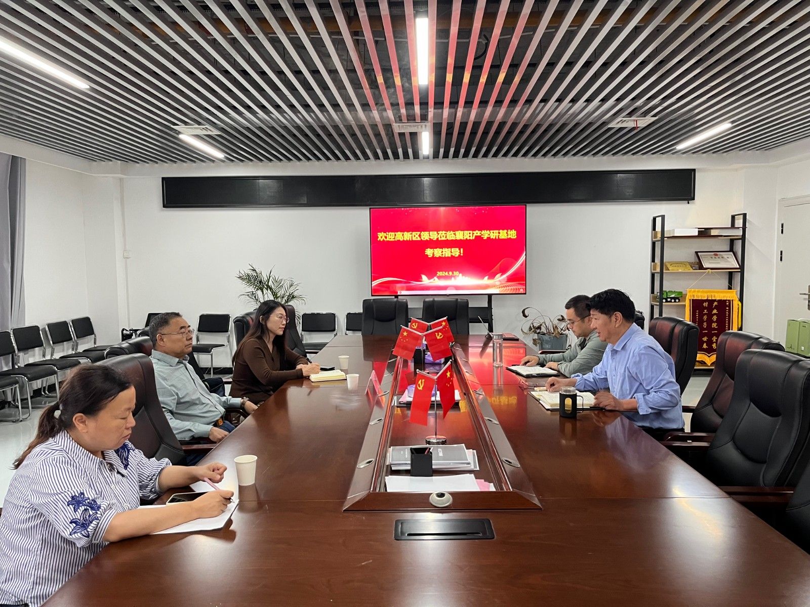 本网讯(文/图 雷金瑾)9月30日上午,襄阳高新区创业服务中心党委书记秦祖馨一行三人到襄阳产学研基地考察调研节前安全稳定工作。基地主任汤德强、分党委副书记余厚德陪同调研。