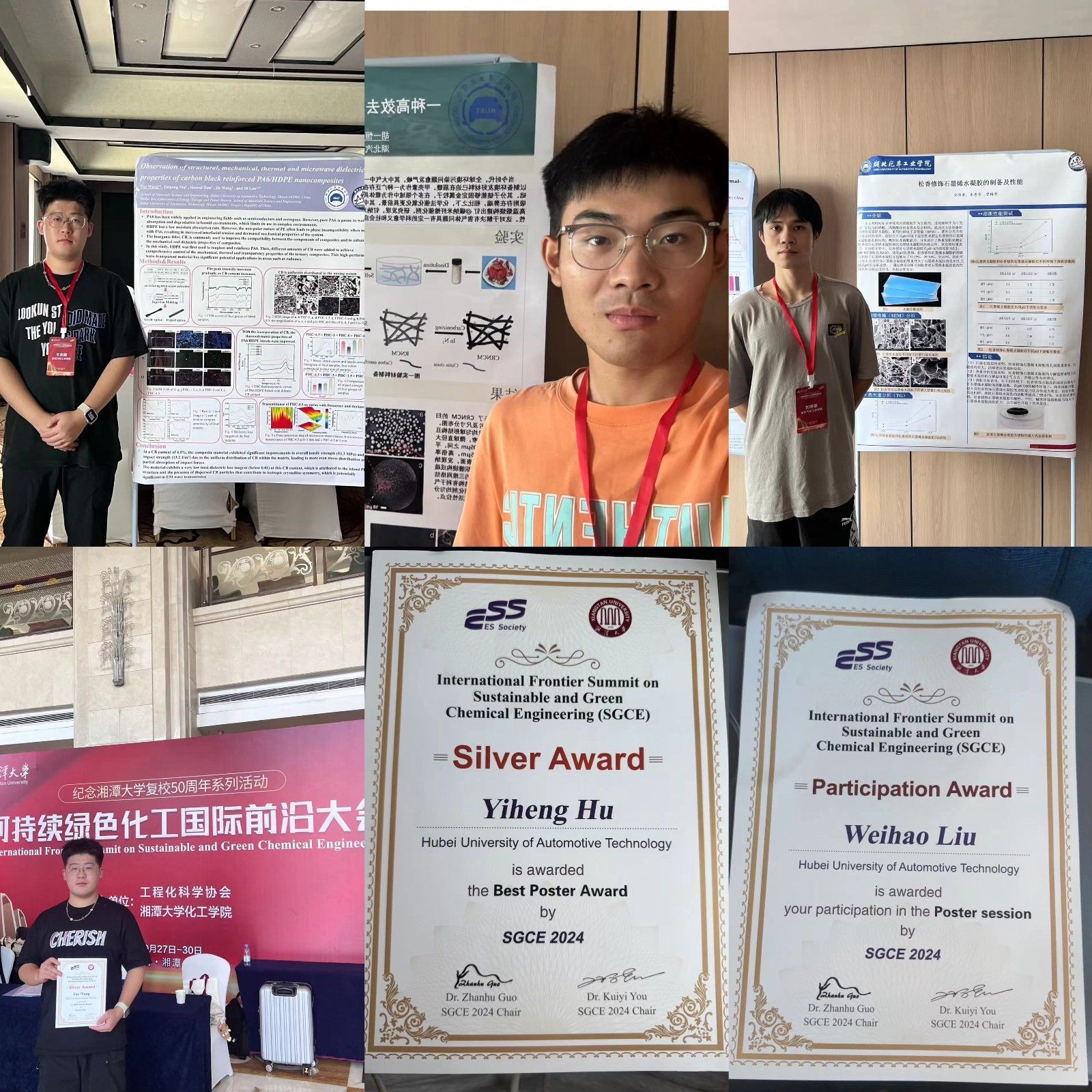 本网讯(文/图 王越)9月27日-30日,2024可持续绿色化工国际前沿大会(SGCE2024)在湖南省湘潭市举办。来自化工科学与工程领域的学者、研究人员和专业人士共赴盛会,探讨当前工程材料和化工行业面临的挑战与未来的发展方向。会议设立了青年研究奖和最佳墙报奖,材料学院研究生牛志鹏、胡一恒荣获最佳墙报奖,刘伟豪荣获参与奖。