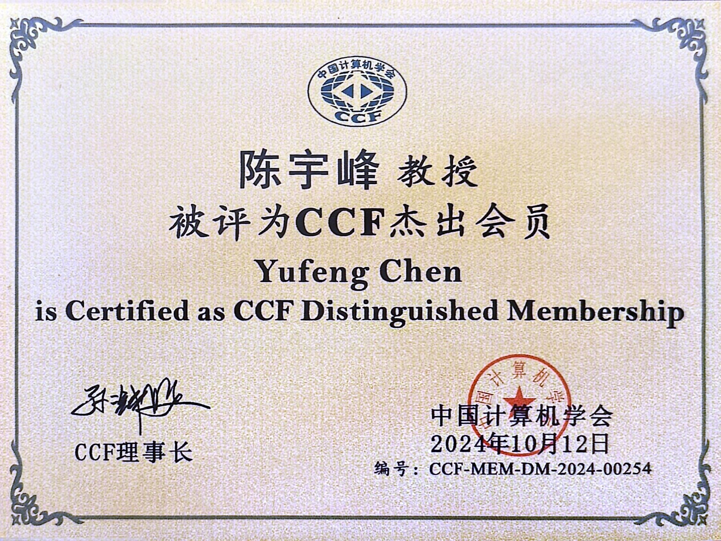 本网讯(文/图 谢晋)近日,中国计算机学会(CCF)发来贺信,鉴于beat365陈宇峰教授在计算机领域取得的成就或长期以来对CCF发展的贡献,祝贺陈宇峰教授当选中国计算机学会杰出会员(CCF Distinguished Membership)。贺信指出,取得CCF杰出会员身份不仅表明CCF的高度认可,也是一项很高的学术荣誉。