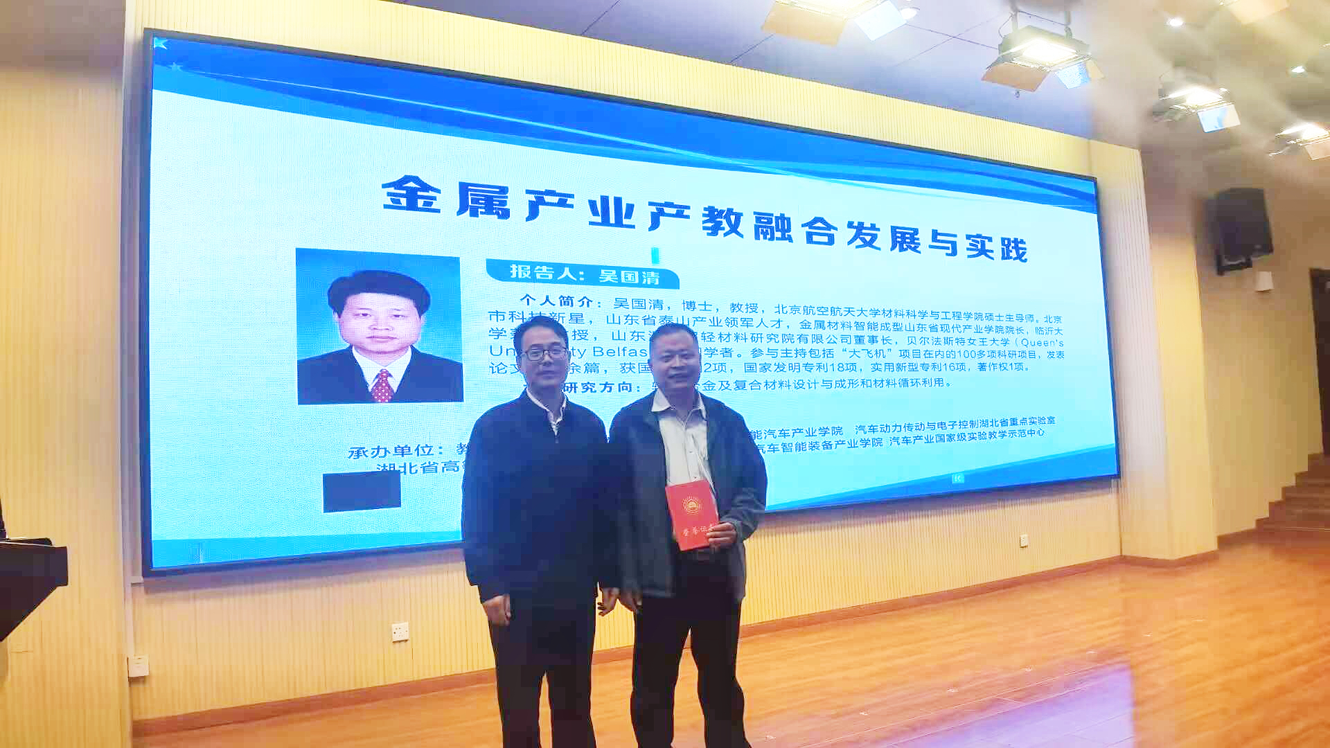 本网讯(文/图 王婕颖)为进一步深化产教融合,高质量建设东风HUAT智能汽车产业学院,11月7日下午,beat365汽车工程学院特别邀请北京航空航天大学材料科学与工程学院硕士生导师,北京市科技新星,山东省泰山产业领军人才,金属材料智能成型山东省现代产业学院院长,山东源航超轻材料研究院有限公司董事长吴国清教授主讲“新质生产力背景下产教融合发展与实践”的系列报告第一讲,讲座由教务处和湖北省高等教育学会汽车工程教育专业委员会共同牵头,校内多个国家级和省级平台共同承办,汽车工程学院具体组织承办。校教务处宫爱红处长、各二级学院教学院长、专业负责人、校级现代产业学院负责人、汽车工程学院全体教职工等参加了此次讲座,宫爱红教授主持报告。
