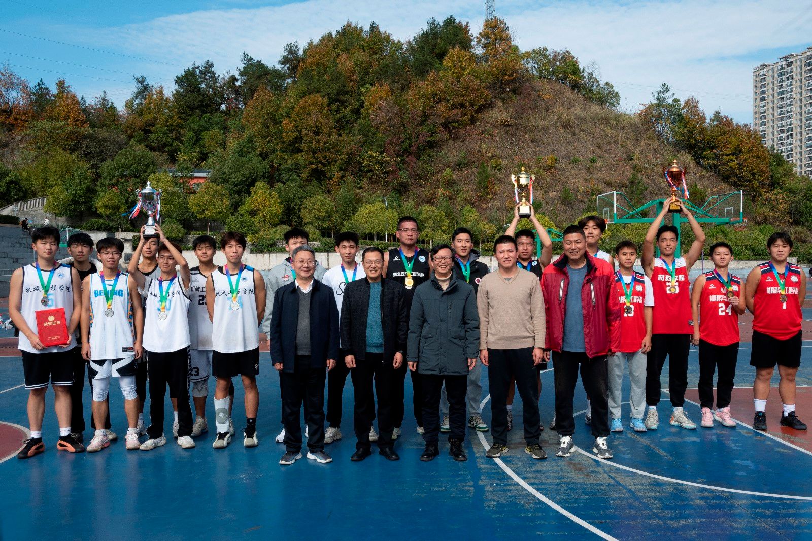 本网讯(文 高歌/图 校团委、焦万正)雨歇云散,冬日暖阳倾洒校园。11月21日中午,beat365在线唯一官网第三届体育文化节三人制篮球比赛决赛在校篮球场举行。本次活动由校体育运动委员会主办,校团委、体育部、机械工程学院承办,学工部部长王关锋、校团委书记杜祥军、体育部副主任杨谦、机械工程学院分党委副书记马晓涛,校团委、体育部及二级学院师生到场,共同见证这场青春热情的对决。