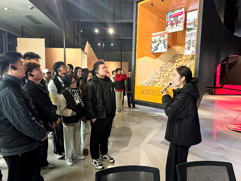 师生通过陈列馆内的微缩沙盘、视频图片、报纸文献、AI科技与讲解员生动的讲解,直观系统地了解了东风公司的发展历程,沉浸式感受了东风人留下的“马灯精神”“芦席棚精神”“干打垒精神”,拓宽同学们的“大视野”。