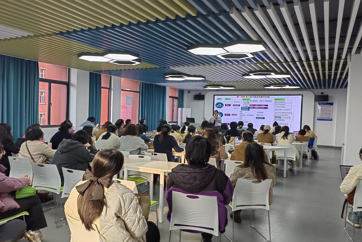 本网讯(文 龙凌/图 龚建强)12月2日下午,国家一流课程负责人、湖北省五一劳动奖章获得者黄冈师范学院张薇薇教授受邀来到外国语学院,进行了题为“赛启智慧,教赢未来,助力教师职业发展”的讲座交流。本次讲座是外国语学院教师发展与课程思政工作坊的第3期,外国语学院全体教师和学校部分其他学院教师参加了本次活动。
