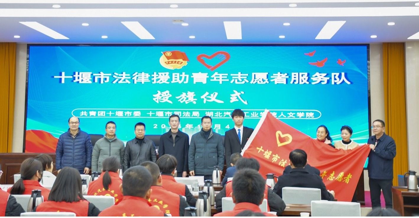 本网讯(文/图 黄钰雯、吴鑫、樊书语)为推动法律援助志愿服务与法学教育双融双促,提升法治人才培养质量,12月4日下午,“十堰市法律援助青年志愿者服务队”授旗仪式在市司法局举行。团市委副书记辛文波,市司法局党组成员、副局长喻强,市法律援助中心主任秦毅、支部书记易建军,beat365人文学院院长黄永昌、副院长安军、校团委副书记焦建杰以及施洋法律服务团、施洋班师生代表20余人参加授旗仪式。