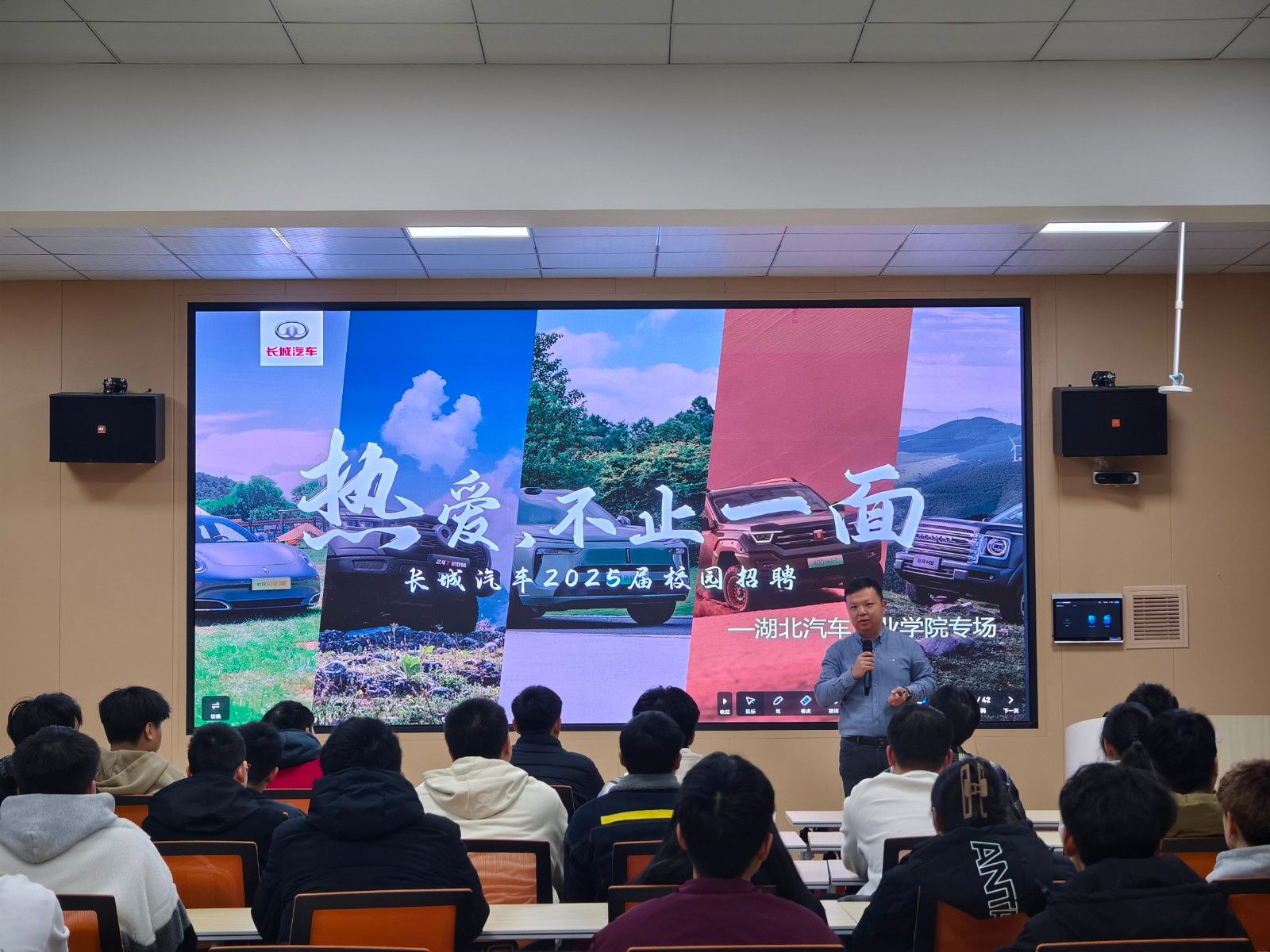 长城汽车股份有限公司荆门分公司人力总监李立鑫介绍了企业的发展历程、招聘岗位、薪资待遇、晋升体系等关键信息,并针对学生们提出的各类疑问给予了耐心详尽的解答。通过宣传片播放与现场互动解答的形式,使学生们直观地领略长城汽车的企业文化、技术成果以及市场领先地位。此次企业提供的招聘岗位广泛覆盖了技术研发、市场营销、生产制造等多个核心领域,为学生们提供了多样化的职业选择与发展机遇。
