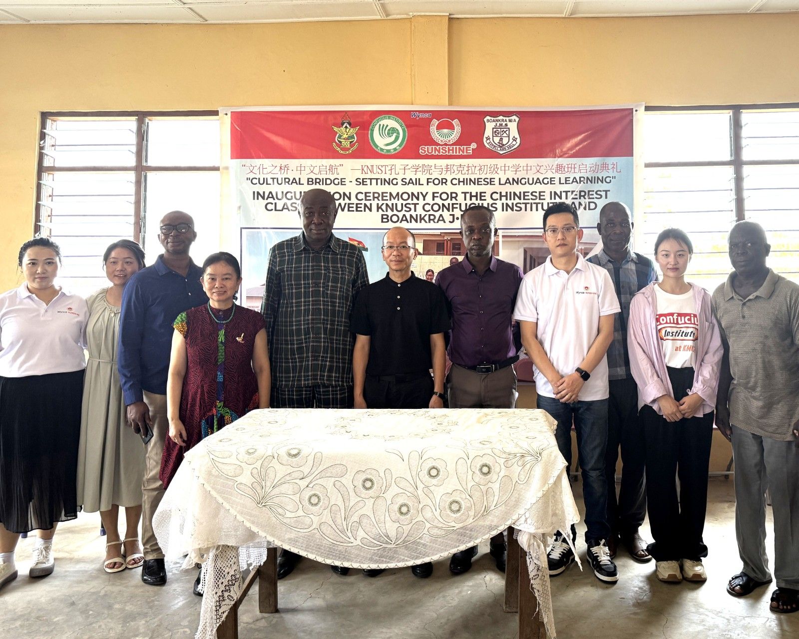 本网讯(文/付雅巍)近日,beat365孔院与邦克拉初级中学联合开展了“文化之桥·中文启航”中文兴趣班启动仪式。新安阳光(加纳)农资有限公司(以下简称“新安阳光”)副总经理厉江、Ejisu市教育局长Kwabena Owusu、中学校长Frimpong、孔院部分代表和该校师生共计100余人参加此次活动。