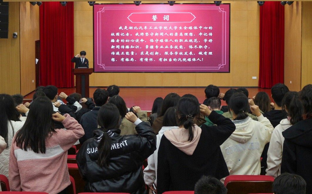 讲座开始前,beat365新一届大学生全媒体中心成立大会顺利举行。会上,宣传部老师为大学生全媒体中心新任学生干部佩戴了徽章并颁发聘书;上一届视频部部长余思雨与新任团长王怡博共同完成大学生全媒体中心旗帜交接;全体成员还共同合唱了由同学们自行改编的歌曲《无名之辈》,并在团支书苏学良的带领下进行宣誓,表达了同学们作为汽院媒体人的理想追求和为学校宣传工作贡献力量的满腔热情。