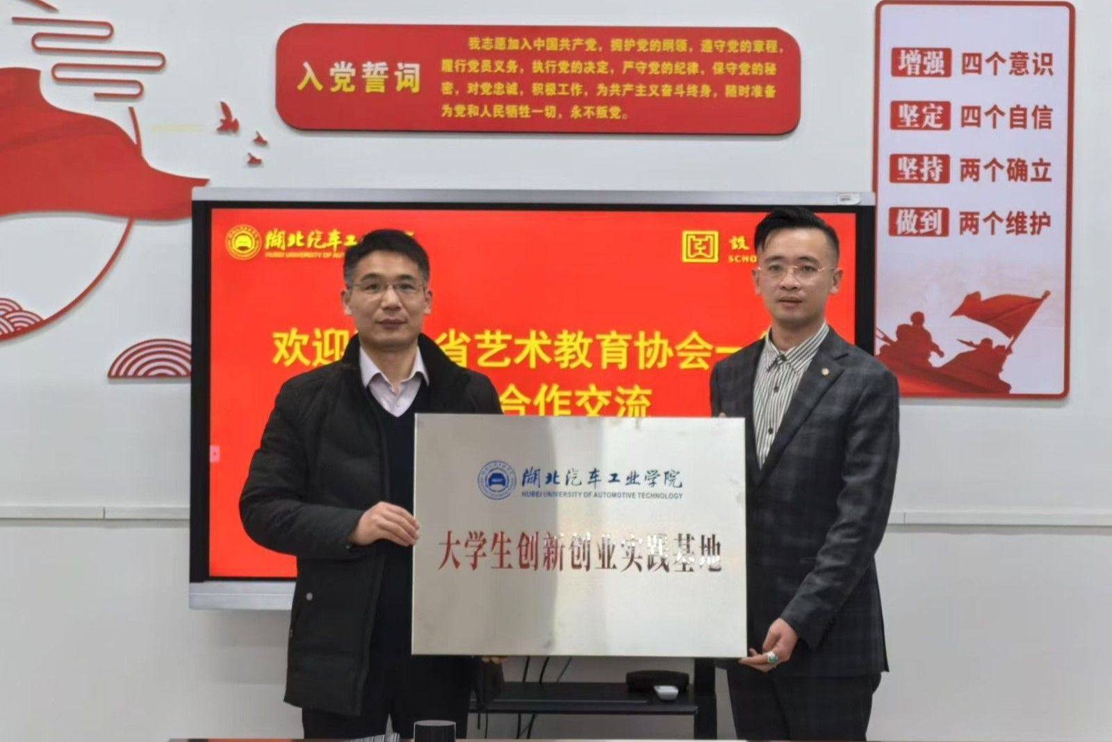 双方还就建设大学生创新创业实践基地达成意向,黄进涛代表学校向湖北省艺术教育协会授牌。