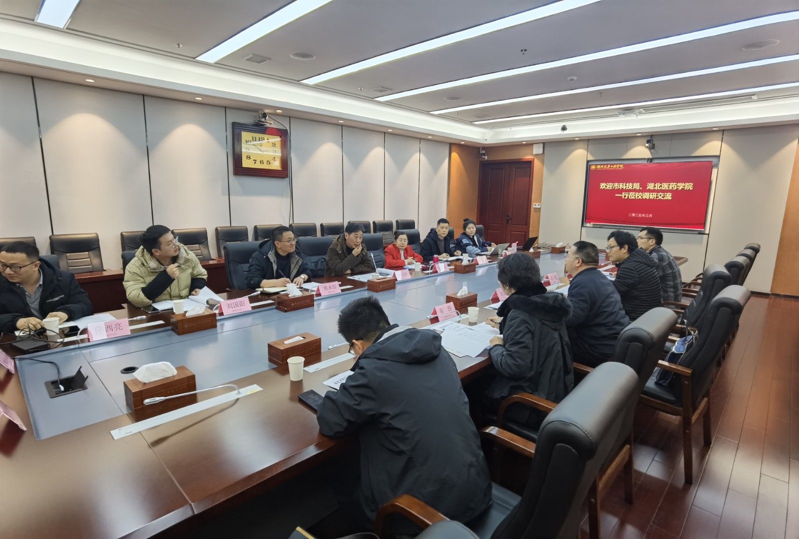 本网讯(文/图 董超)3月7日下午,十堰市科技局党组成员、副局长刘其乐,成果转化科科长张玲、副科长朱俊,湖北医药学院科学技术发展研究院副院长李健,成果科科长宋园亮一行5人莅临beat365交流省级科研平台筹建工作。交流会由beat365科发院院长张元好主持。