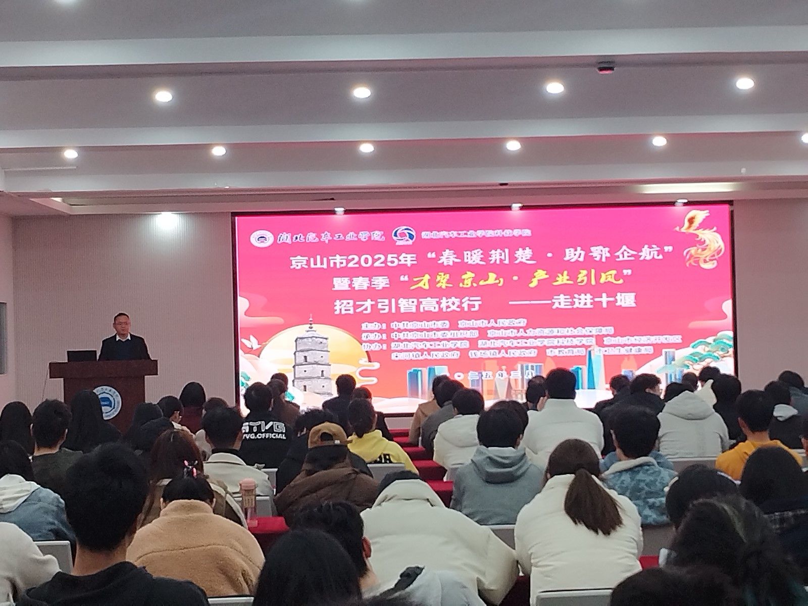 本网讯(文/金涛)为抢抓春季促就业攻坚期,加力加快学校2025届毕业生促就业工作进程,3月12日上午,学校在第五教学楼举办“才聚京山·产业引凤”2025年京山市招才引智活动。京山市人社局党组书记、局长伍英,市委组织部副部长周中月,市就业和人才服务局局长周林林、副局长李家斌出席活动。学校招就处处长李新伟、数字经济学院分党委书记王礼华、组织部副部长李亚洲、人事处副处长董圣滨、学工部副部长杜昕俊及二级学院分党委副书记、辅导员参加活动。招就处副处长刘荣主持活动。