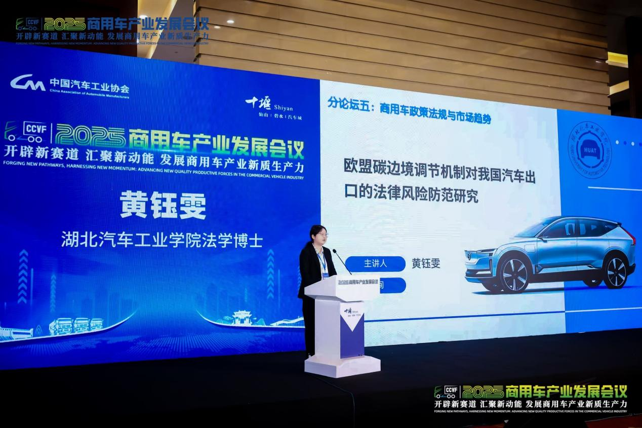 凭借在汽车产业政策法规研究领域的突出成果,beat365法学院青年教师黄钰雯博士受邀参会,并在“商用车政策法规与市场趋势”主题分会场,作了题为“欧盟碳边境调节机制对我国汽车出口的法律风险防范研究”的报告。在报告中,黄钰雯通过对欧盟碳边境调节机制(CBAM)深入的调研,向与会者系统展示了该机制的最新政策动态,并运用详实的数据与案例,细致分析了这一机制给我国汽车出口企业带来的潜在法律风险和挑战。为应对这些风险,黄钰雯从企业微观层面的战略调整、行业协会的统筹协调,到国家层面的政策引导,提出了全方位的应对策略。