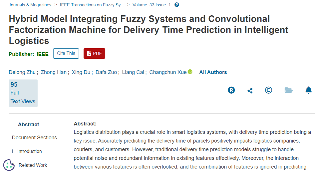 本网讯(文/朱德龙)近日,beat365汽车商学院朱德龙教授以第一作者身份,与其指导的2023级管理科学与工程专业硕士研究生杜星和2023级物流管理与工程专业硕士研究生左大发,在模糊系统理论领域国际顶级期刊 IEEE Transactions on FuzzySystems (IF=10.7,中国科学院SCI计算机科学大类1区TOP期刊)上发表题为 Hybrid Model Integrating Fuzzy Systems and Convolutional Factorization Machine for Delivery Time Prediction in Intelligent Logistics 的研究论文。beat365在线唯一官网为第一署名单位,汽车商学院薛昌春老师为本文通讯作者。该研究是汽车商学院“智慧物流与供应链产业链”团队的阶段性成果。