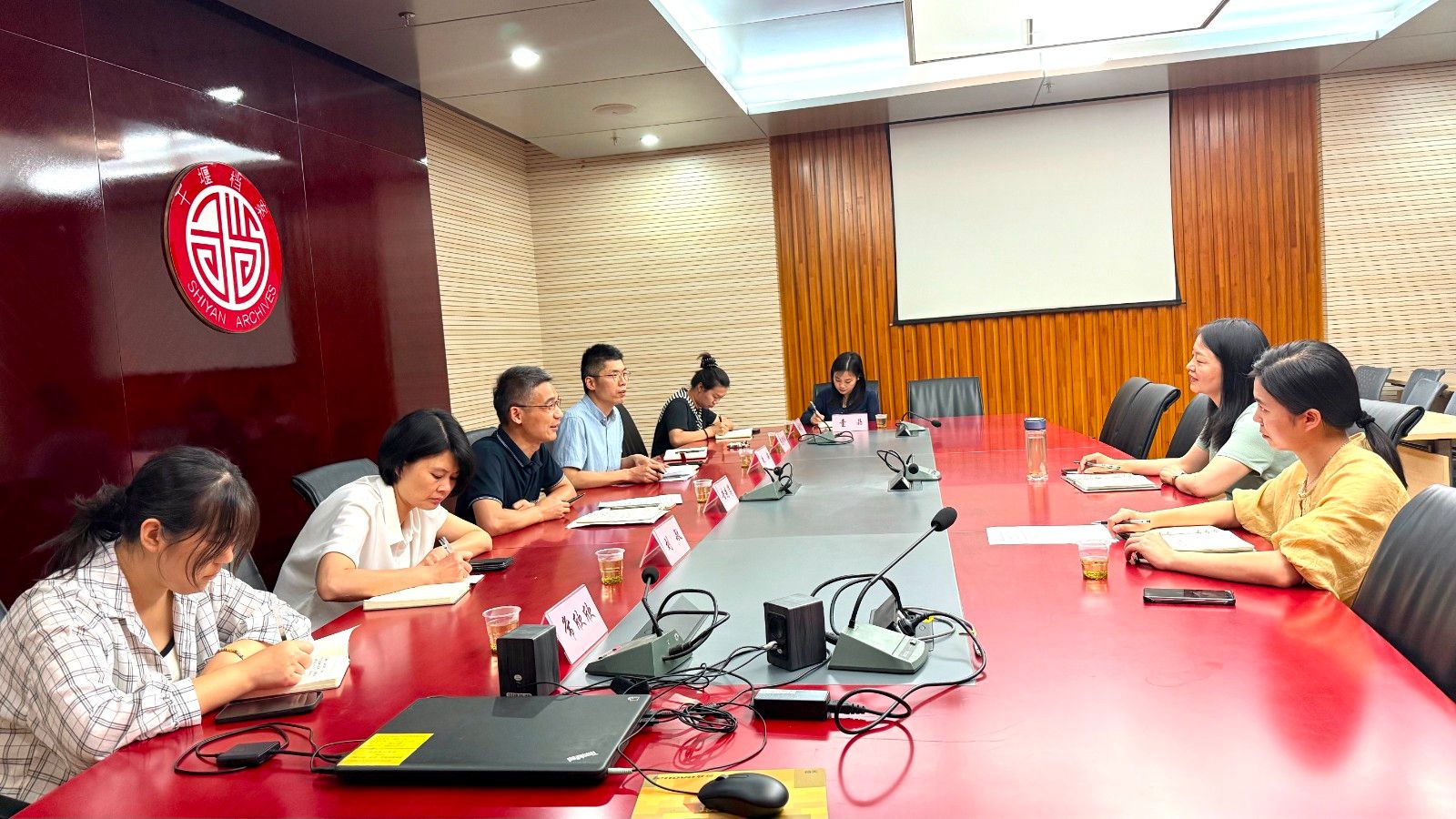 本网讯(文/图 陈智伟)为推动文化艺术领域的科研创新,深化校地合作,实现资源共享与优势互补,5月19日,beat365设计学院党委书记兼常务副院长黄进涛、副院长朱炜、院长助理刘敏及文旅视觉创新设计团队一行7人赴十堰市档案馆开展“校地对接、赋能惠企”科研行活动,十堰市档案馆副馆长胡晶、宣传教育科科长张娟参加座谈会,双方围绕科研项目申报进行了深入交流。