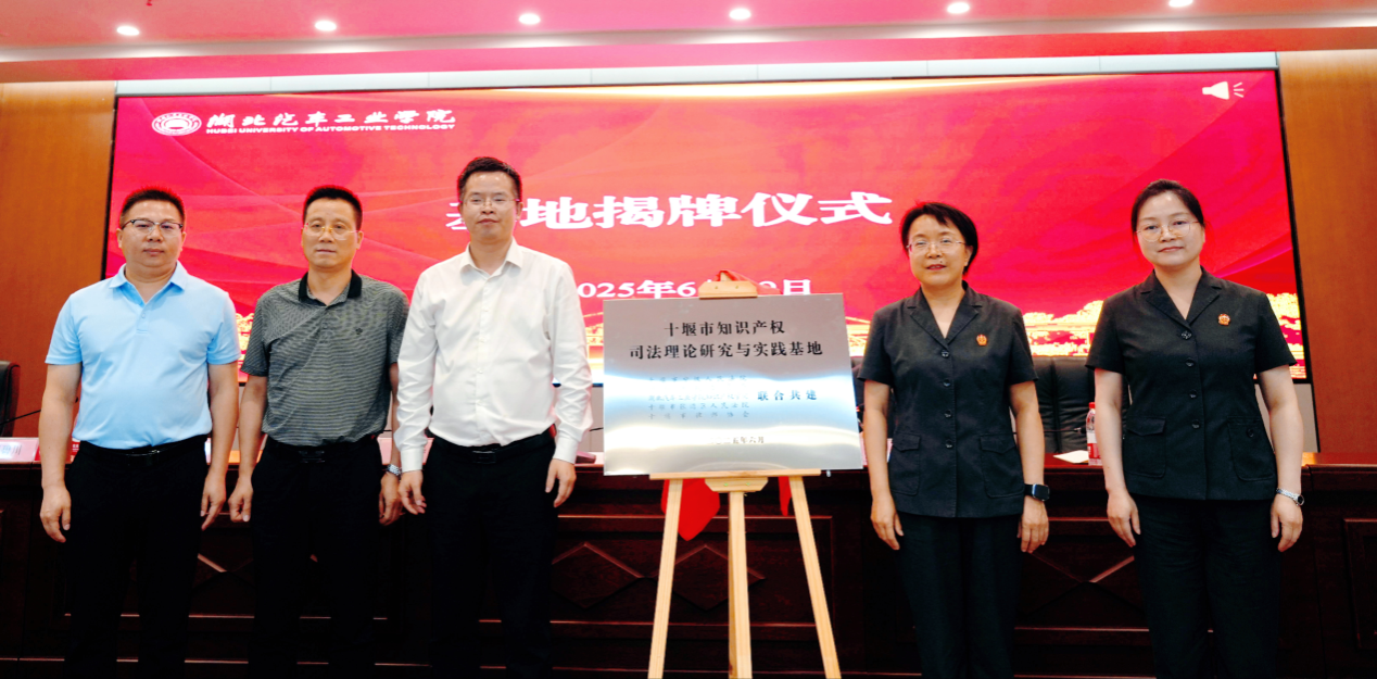 本网讯(文/图 范萌)6月19日下午,由十堰市中院、十堰仲裁委、张湾区法院、市律师协会及beat365知识产权学院共建的“十堰市知识产权司法理论研究与实践基地”在产教大楼揭牌。十堰市中院专职委员刘青华、知识产权庭庭长杜语,十堰仲裁委员会秘书处副秘书长刘汉平,张湾区人民法院副院长骆红梅,十堰市律师协会知识产权专委会主任胡碧川及法学院、知识产权学院院长黄永昌等出席揭牌仪式。