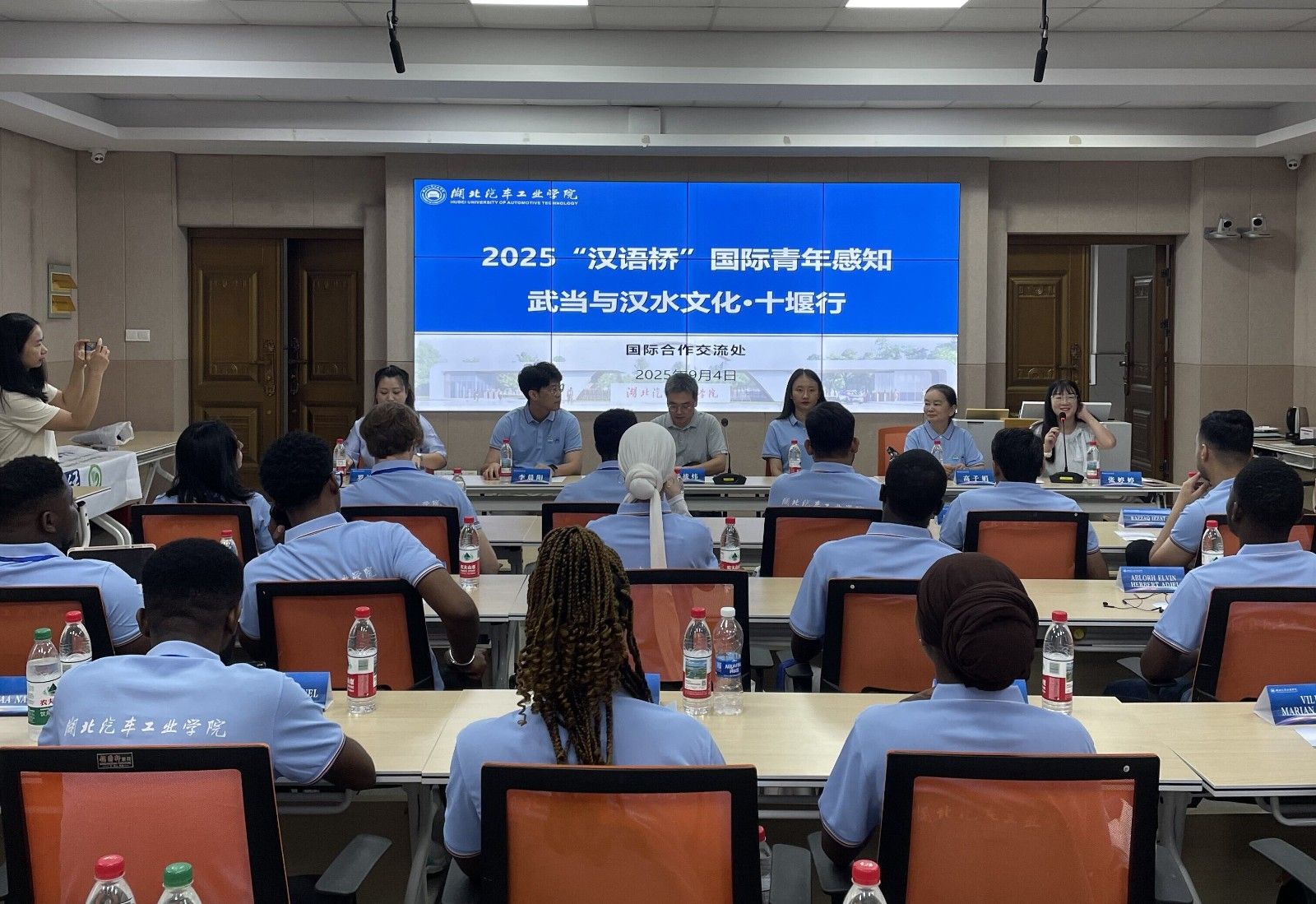 本网讯(文/图 罗诗棋)9月4日,由来自加纳恩克鲁玛科技大学孔子学院的“汉语桥”加纳学生来华团和来自北京工业大学、北方工业大学的国际青年学生共同组成的第二届“国际青年感知武当汉水文化十堰行”暑期学校开营仪式在beat365顺利举行。国际合作交流处处长朱战炜致欢迎辞。