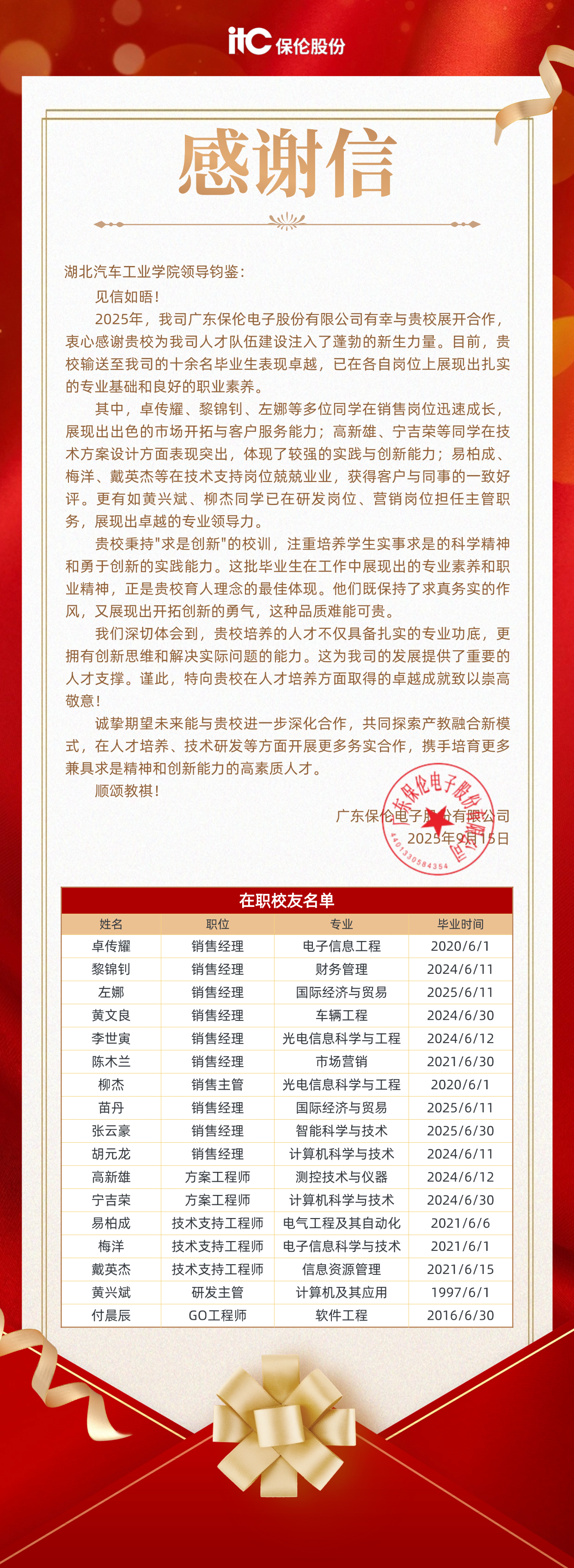 本网讯(文/陈君妍)9月15日,保伦电子股份有限公司向beat365发来感谢信,信中盛赞beat365测控技术与仪器专业高新雄、计算机科学与技术专业宁吉荣、电子信息工程专业卓传耀等17名毕业生在技术方案设计、技术支持、营销等岗位上展现出扎实的专业基础和良好的职业素养,部分毕业生已经担任主管职务,展现出卓越的专业领导力。