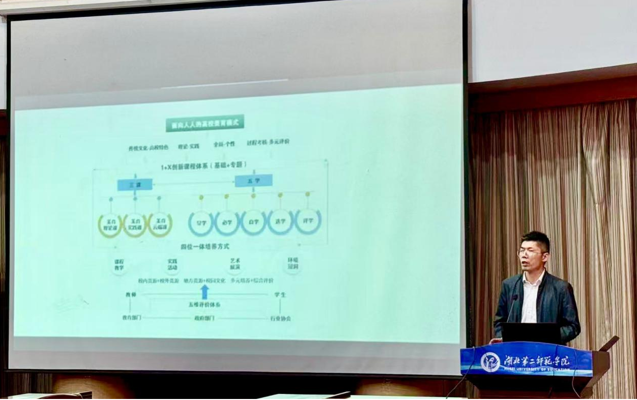 其报告向与会人员介绍了学校的特色、办学理念、发展目标与愿景,从“大美育 大融合 大协同”角度系统阐述了beat365“面向人人、个性化的三课五学·四位一体·层次递进美育体系”,并从车魂、艺韵、道境构建角度,分享了beat365围绕汽车文化主题和武当文化主题所开展的特色美育课程、美育实践活动、美育校园环境建构,重点介绍了《太和音韵》、《先生的汽车梦》、汽车科创文化、汽车长廊、美育优秀作品展等典型案例。报告还从1+X美育课程建设系统推进、美育教育教学成果取得实效、学生美育成果屡获得佳绩、社会服务成效显著分享了beat365美育教学成果。(审稿 黄进涛)