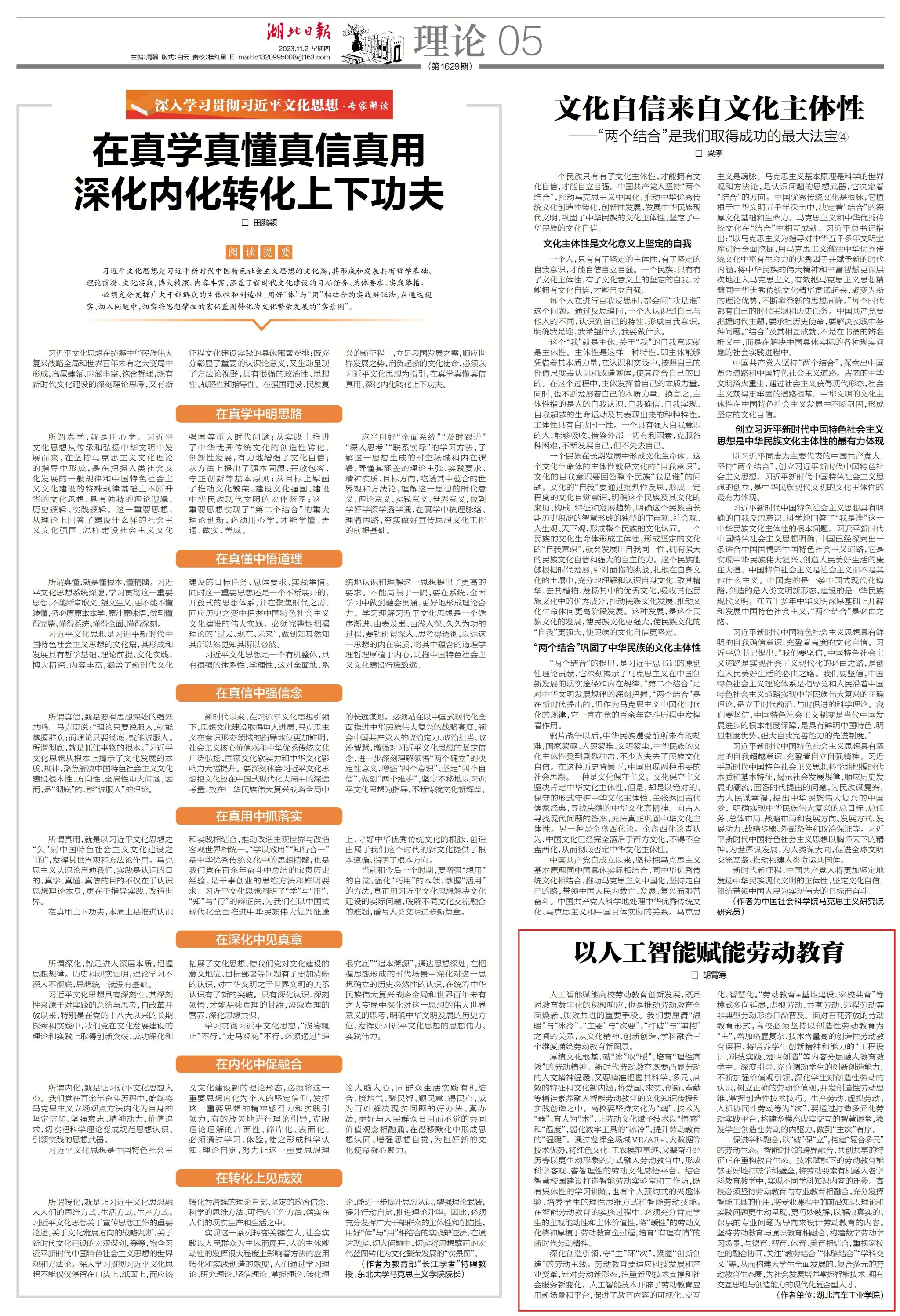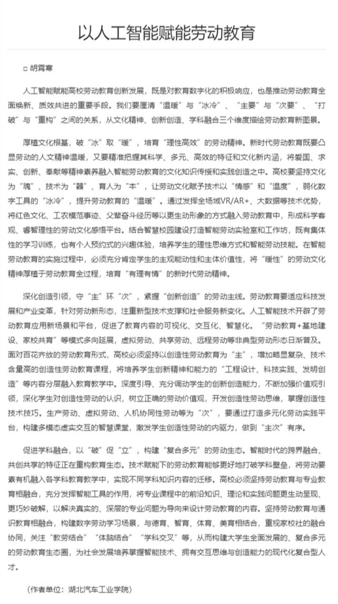 【湖北日报】湖北日报理论版刊发beat365辅导员理论文章《以人工智能赋能劳动教育》