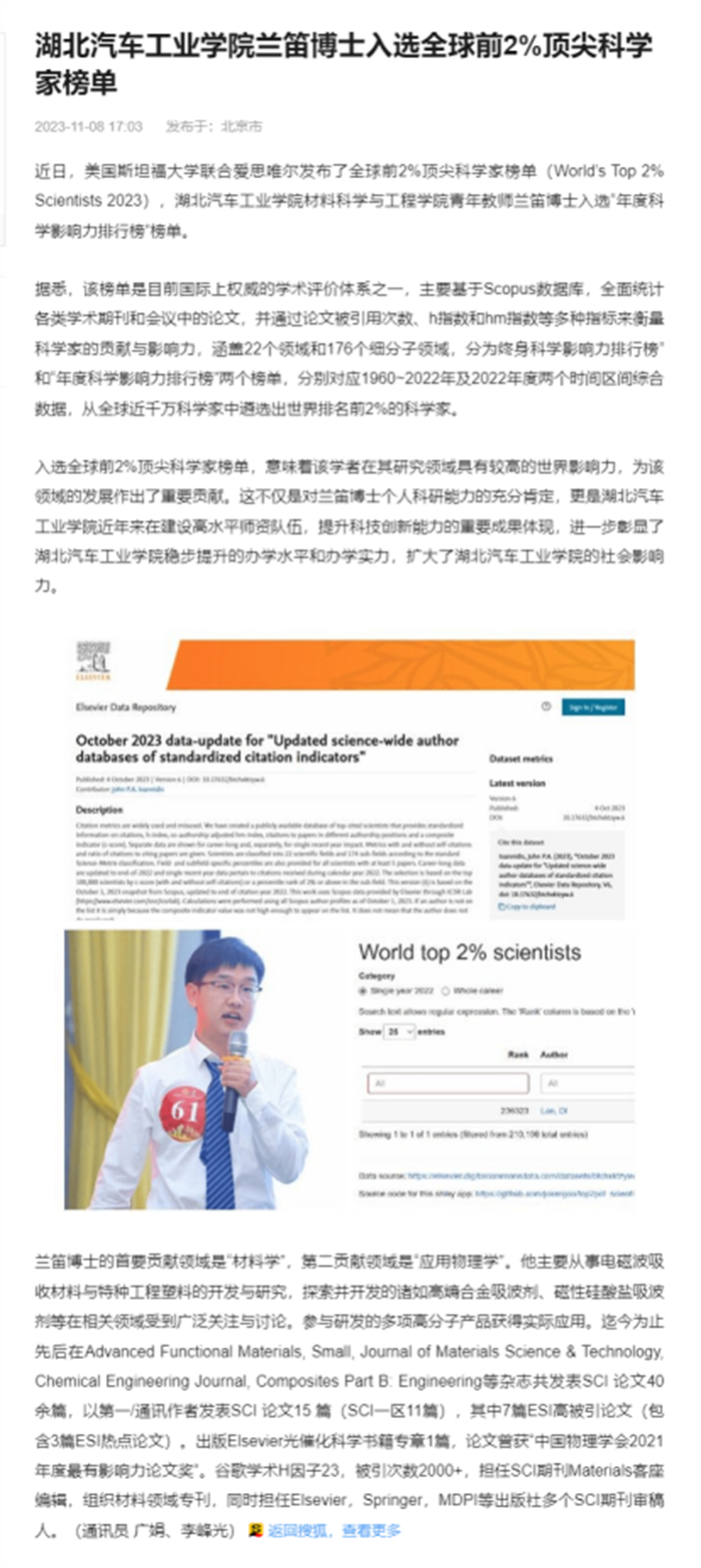 【搜狐】beat365在线唯一官网兰笛博士入选全球前2%顶尖科学家榜单