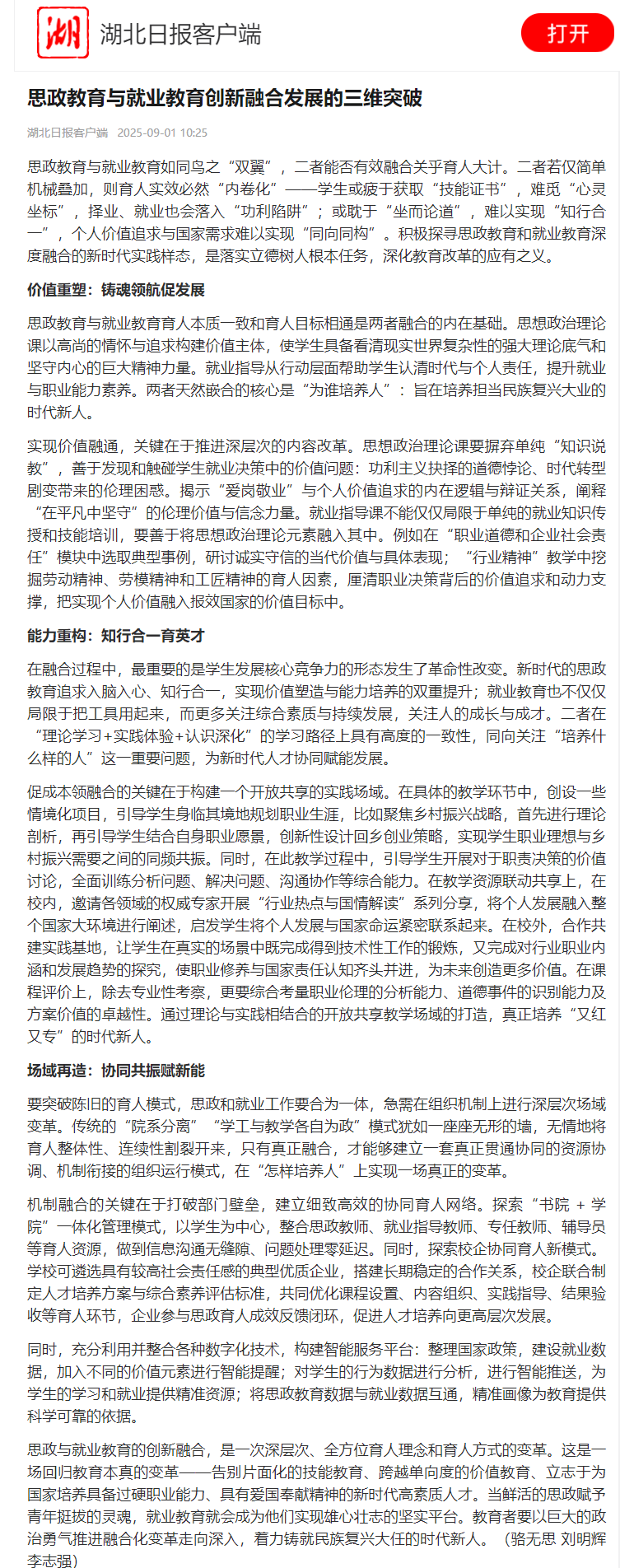 【湖北日报】思政教育与就业教育创新融合发展的三维突破