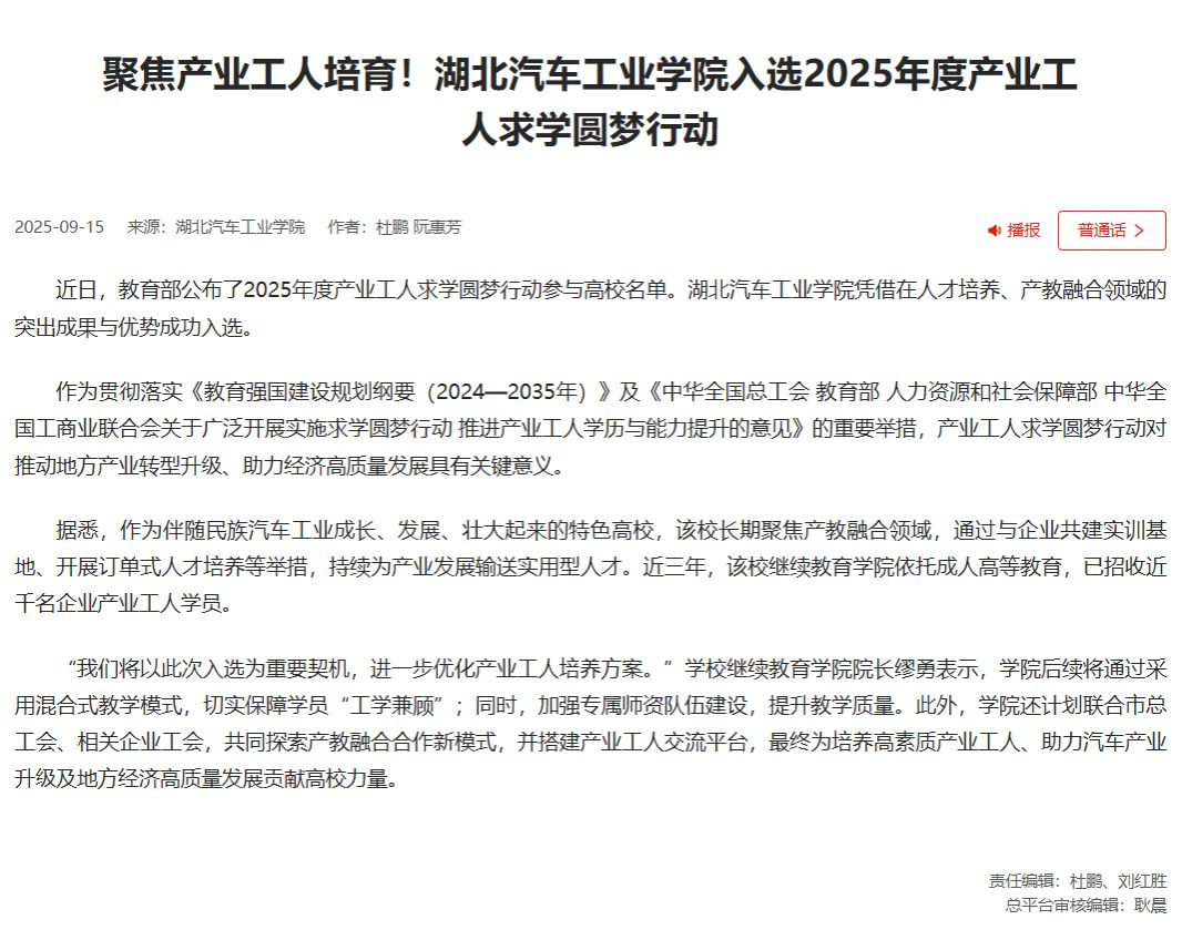 【学习强国总平台】聚焦产业工人培育!beat365在线唯一官网入选2025年度产业工人求学圆梦行动