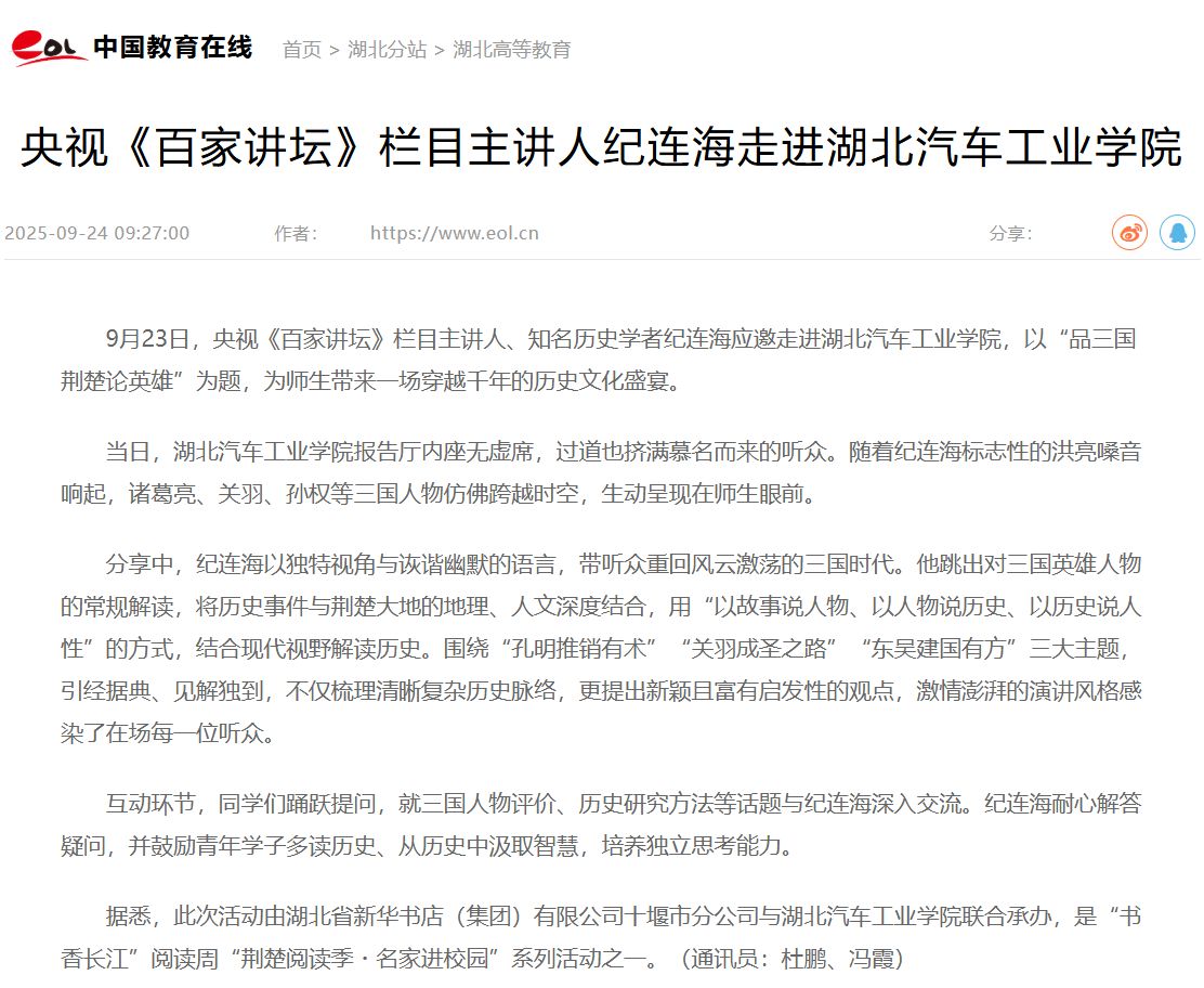 【中国教育在线】央视《百家讲坛》栏目主讲人纪连海走进beat365在线唯一官网