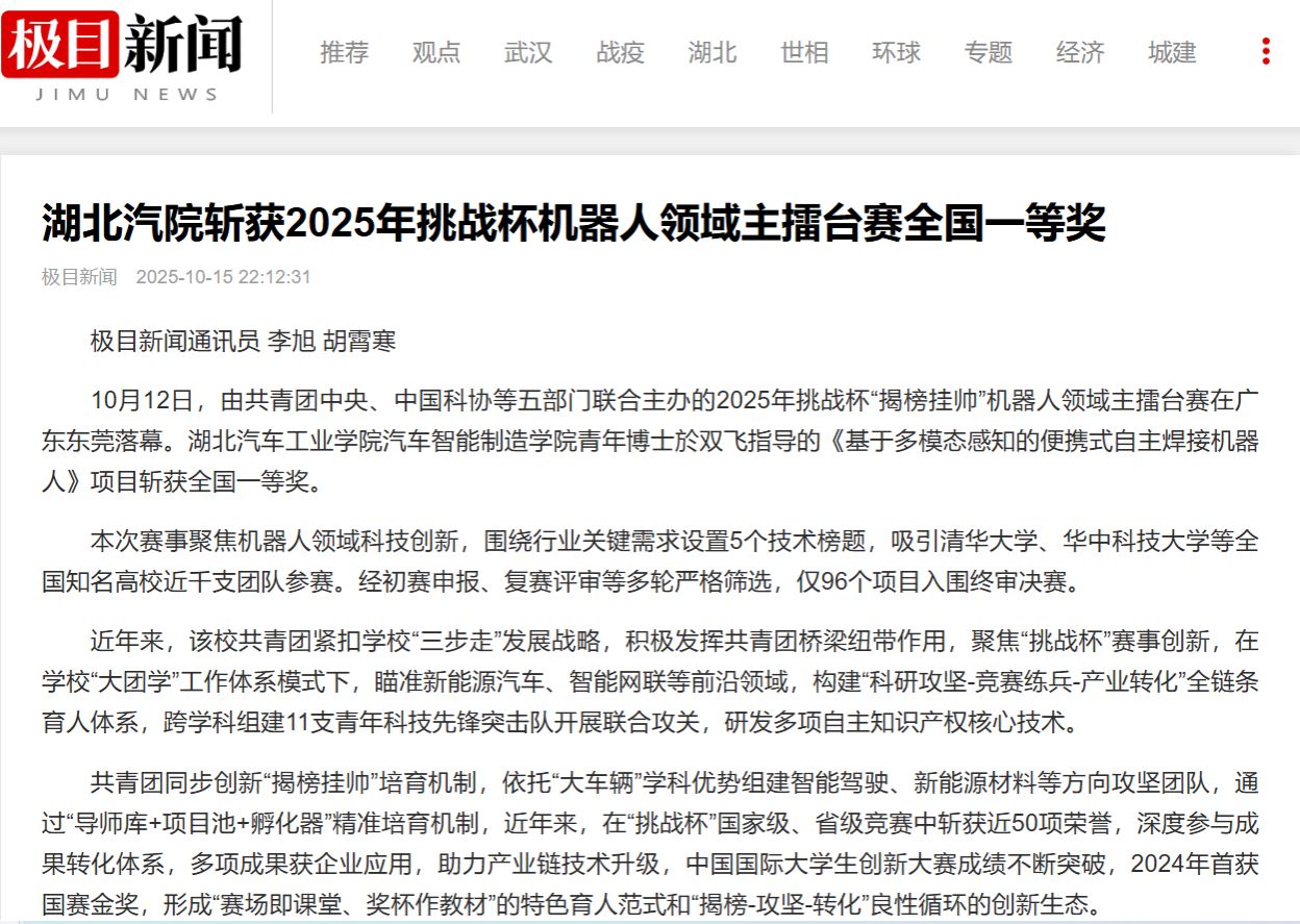 【极目新闻】湖北汽院斩获2025年挑战杯机器人领域主擂台赛全国一等奖