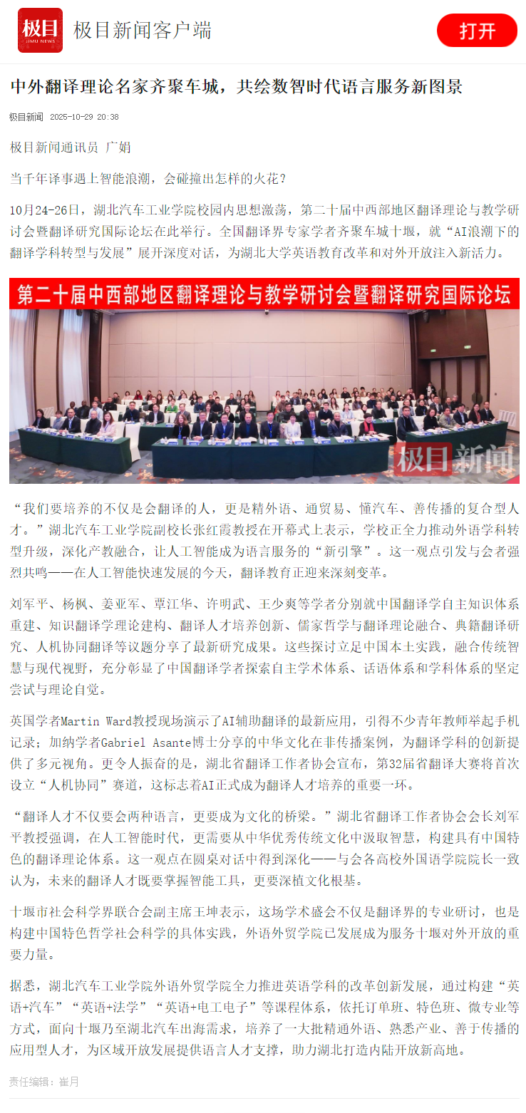 【极目新闻】中外翻译理论名家齐聚车城,共绘数智时代语言服务新图景