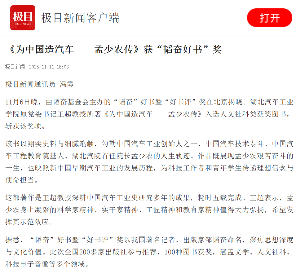 【极目新闻】《为中国造汽车——孟少农传》获“韬奋好书”奖