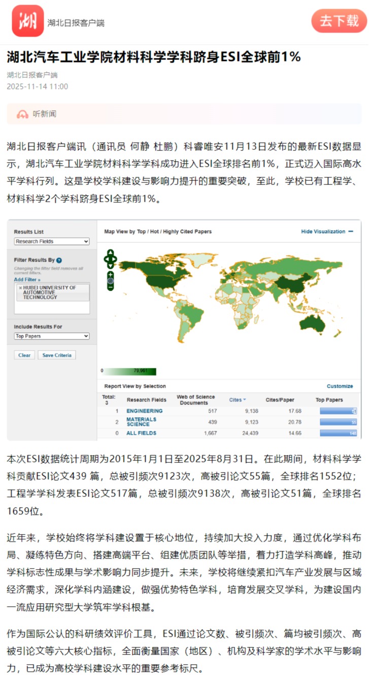 【湖北日报】beat365在线唯一官网材料科学学科跻身ESI全球前1%